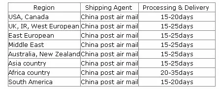 Авиа-отправление Почты Китая Обычно товар прибудет в течение 15-25 рабочих дней после отправки. Иногда из-за таможенных процедур или погодных условий может возникнуть задержка на несколько дней. Это может быть до 30-45 дней.