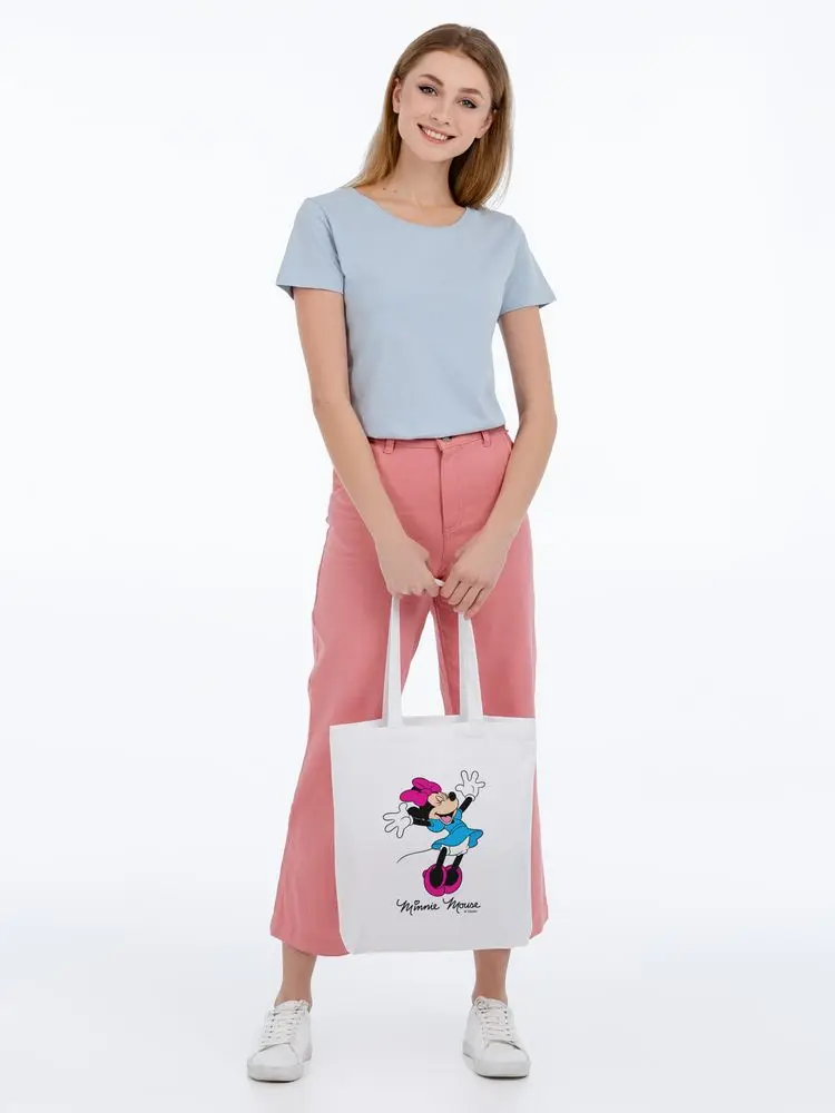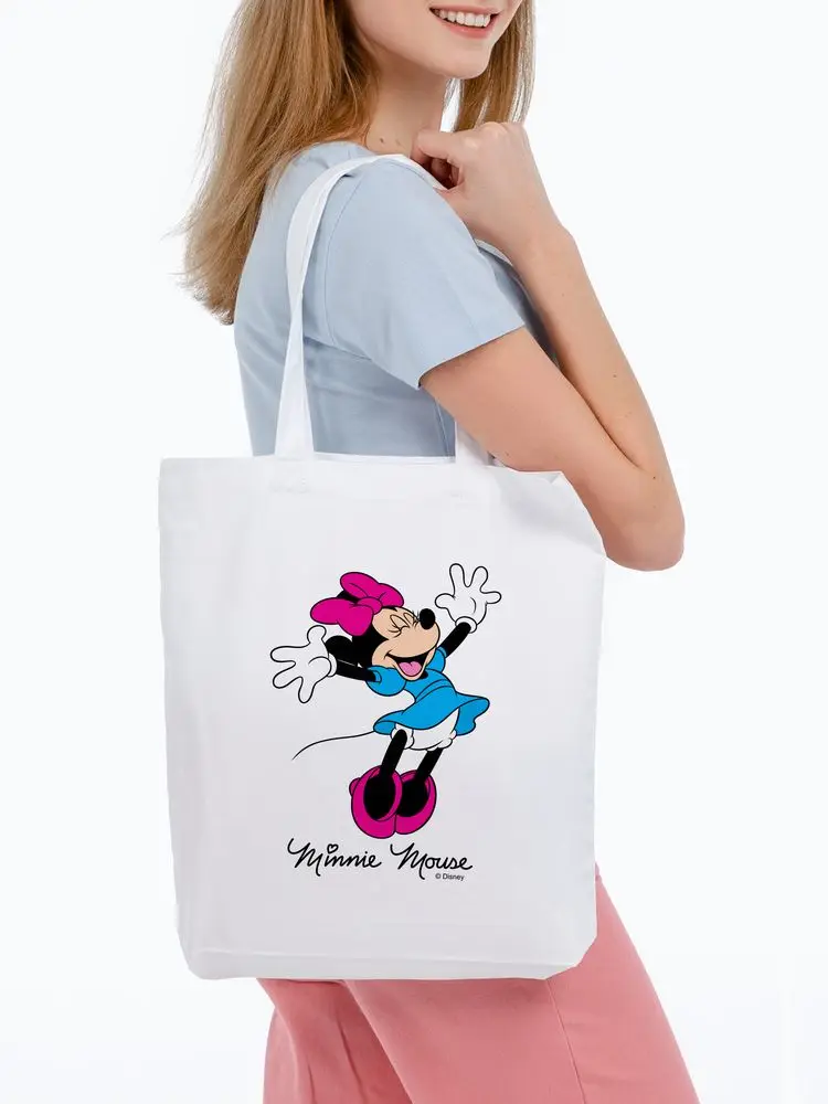 Спешите по делам? Готовитесь к путешествию? Возьмите с собой модницу Минни, она знает толк в радостном настроении и будет озорной подружкой. Романтичная, милая и внимательная, она стала знаменитой на весь мир благодаря своим платьицам в горошек и лодочкам, настоящая леди- Минни Маус! Классический шоппер с кокетливой Минни Маус практичный и удобный, из натурального хлопка приятен на ощупь. Компактный и всегда пригодится во время шопинга, отдыха, учебы. Без проблем вмещает тетради, книги, покупки и выдерживает вес до 10 кг. Ручки 54 см комфортны для рук. Все внутренние швы обработаны оверлоком и не разойдутся. Рекомендуем бережную стирку при температуре не выше 30 градусов, гладить можно в режиме для хлопка с изнанки, чтобы красивый принт долго вас радовал.