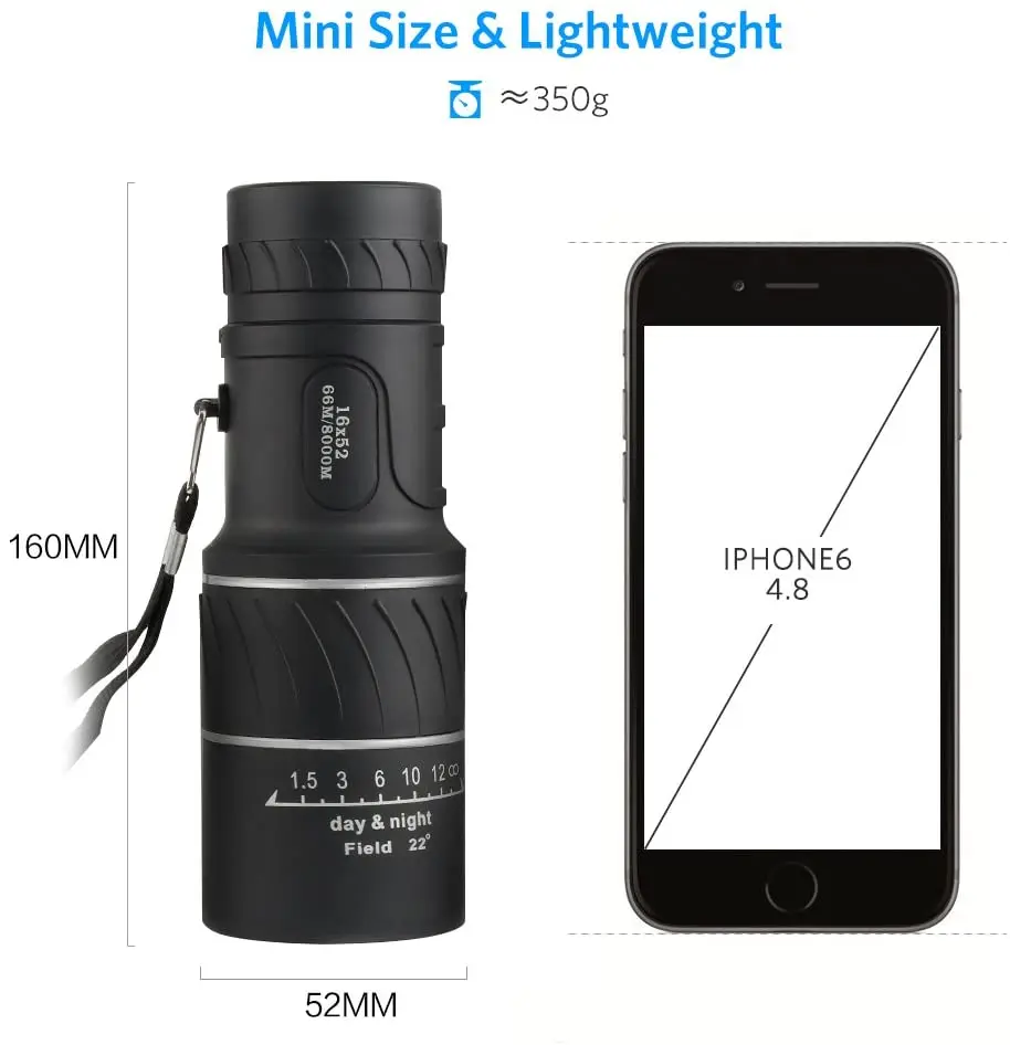 Система фокусировки: центр Призмовая система: крыша Увеличение: 16x Диаметр объектива: 52 мм Диаметр линз: 16 мм Выходного зрачка: 5,2 mmField зрения: 2 км Размер: около 15,1 см x 5,2 см/5,9 "x 2,0"(LxD) Примечание: не смотрите прямо на солнце через телескоп, иначе это повредит ваши глаза.