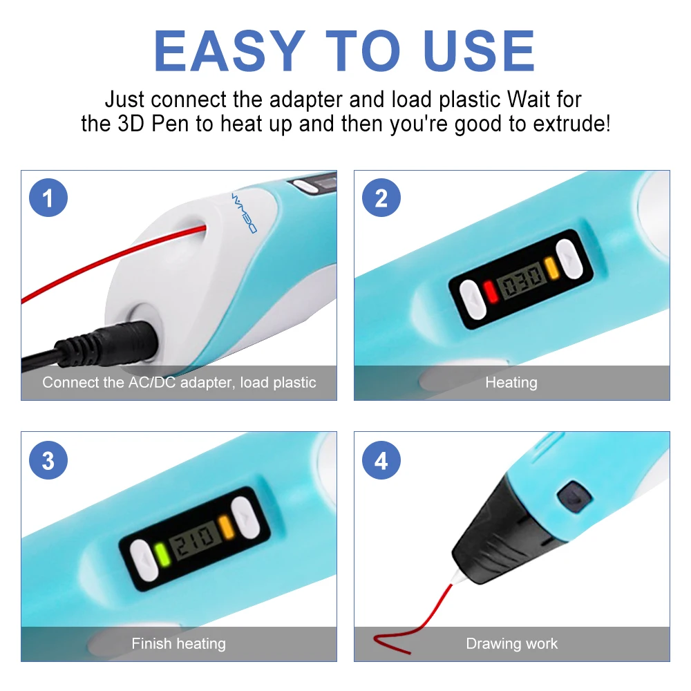 Автоматический спящий режим! В 3d Ручка автоматически перейдет в спящий режим в том случае, если вы не используете 3d печать pen в течение 2 минут или дольше. Прост в использовании! Желтый светильник указывает на мощность. Пресс нагрузки нити переключатель. Красный светильник на режим нагрева, когда красный светильник обратиться к синий, показать подогрева готовой. Ультра безопасно! Прошло сертификацию CE/RoSH/FCC/EN71 обнаружения. Регулируемая скорость печати! Возможность регулировки скорости, сдвинув соответствующую кнопку. В режиме реального времени отзывы! В светодиодный экран способен отображение текущей информации от температуры особенно быстро.