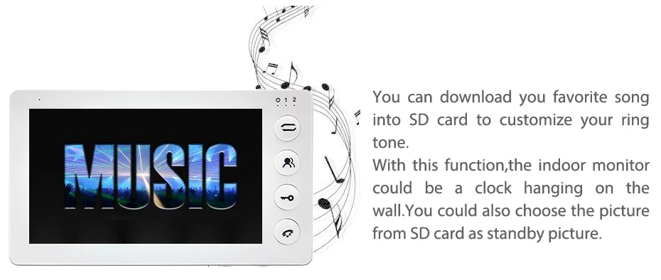 1. Запись sd-карты, запись обнаружения движения 2. Поддержка sd-карты до 32 Гб 3. Поддержка 1 монитора 1 дверного звонка и 1 камеры видеонаблюдения 4. Поддержка электронного замка 5. Языковая поддержка английского/русского/ 6. Настройка мелодии звонка и изображение в режиме ожидания 7. Разрешение: 800*480