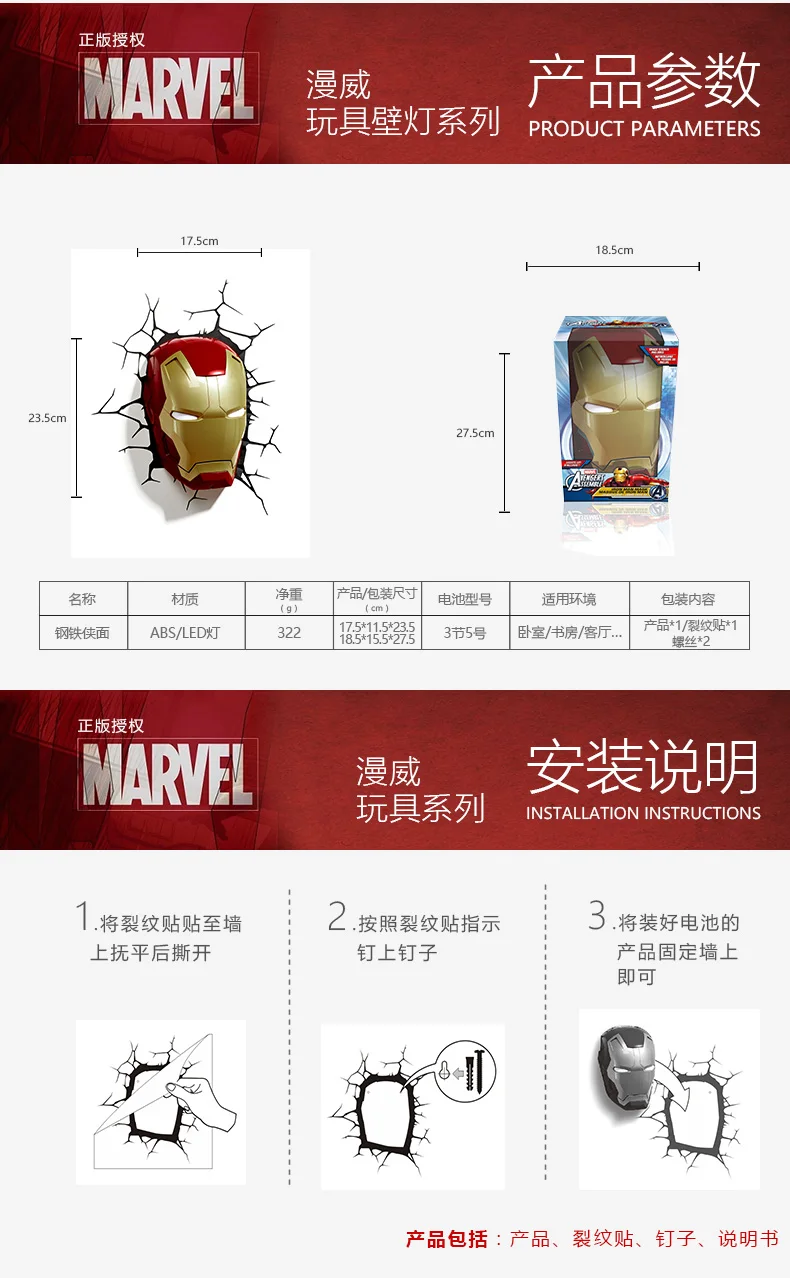 Светильник до вашего ребенка (ые) с помощью этого 3D Молот Тора настенный Ночной светильник. Потрескавшаяся наклейка за этим 3D лампой-деко делает ее похожей на молоток супергероя, разбившийся через стену. Приблизьтесь к действию с вашими любимыми супергероями с этими 3D ночными огнями! Все огни включают в себя 3D наклейка для трещин, чтобы придать внешнему виду, что персонаж разбился через Вашу стену. Успокаивающее свечение обеспечивает необходимый светильник для полуночных изменений, кормлений, успокаивающих проверок. Весь светильник работает от аккумулятора и работает от 3 батареек АА. Они имеют переключатель ВКЛ./ВЫКЛ., идеально подходит для комнат с ограниченным количеством розеток. Не забудьте собрать их все!