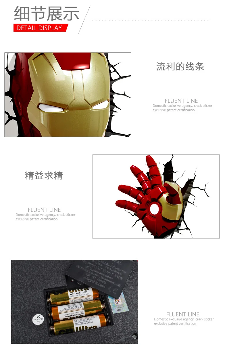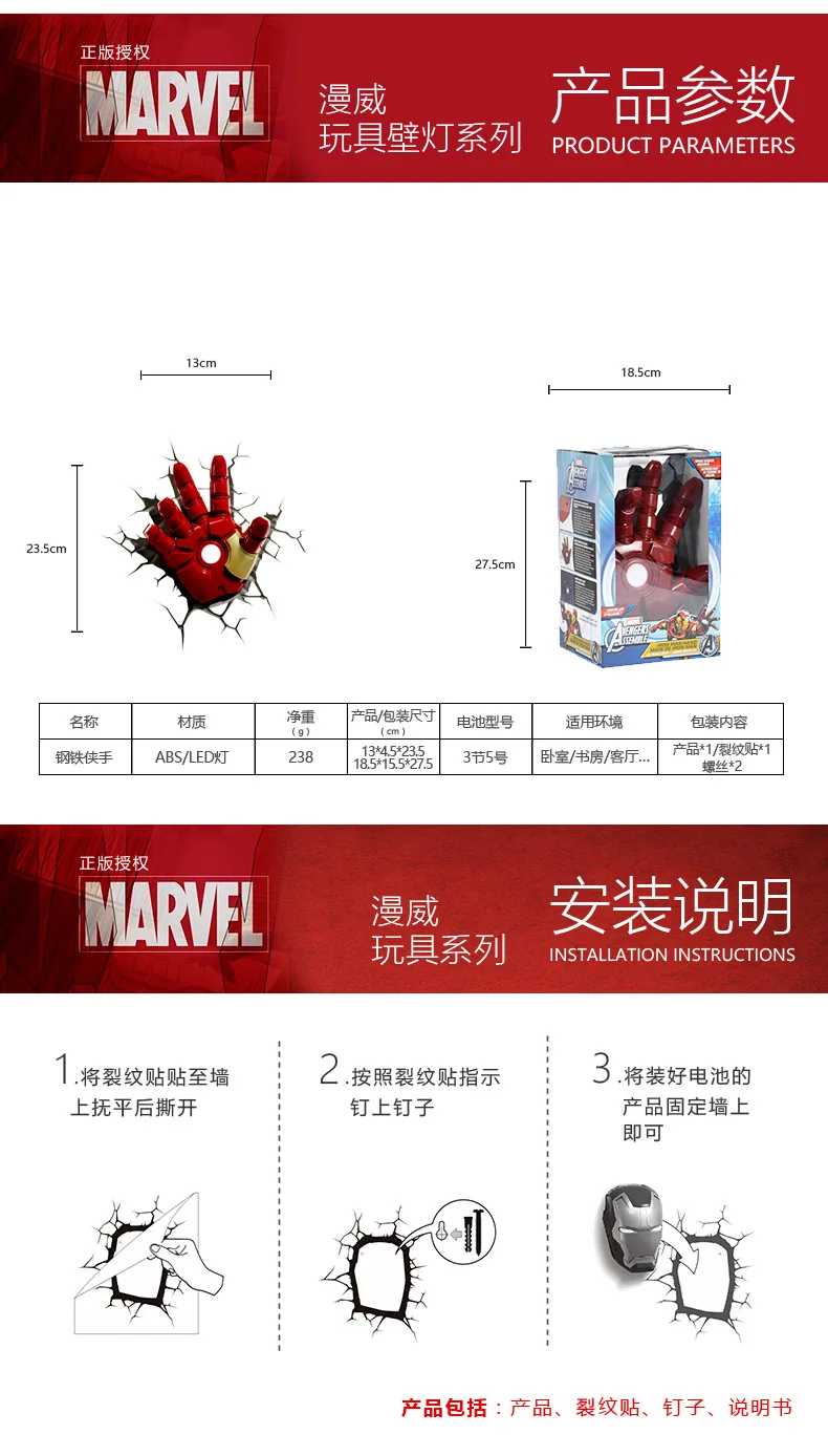Светильник до вашего ребенка (ые) с помощью этого 3D Молот Тора настенный Ночной светильник. Потрескавшаяся наклейка за этим 3D лампой-деко делает ее похожей на молоток супергероя, разбившийся через стену. Приблизьтесь к действию с вашими любимыми супергероями с этими 3D ночными огнями! Все огни включают в себя 3D наклейка для трещин, чтобы придать внешнему виду, что персонаж разбился через Вашу стену. Успокаивающее свечение обеспечивает необходимый светильник для полуночных изменений, кормлений, успокаивающих проверок. Весь светильник работает от аккумулятора и работает от 3 батареек АА. Они имеют переключатель ВКЛ./ВЫКЛ., идеально подходит для комнат с ограниченным количеством розеток. Не забудьте собрать их все!