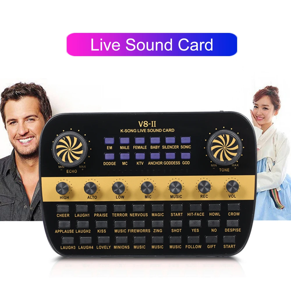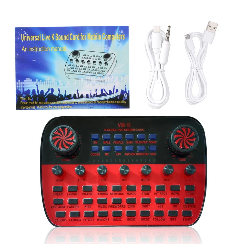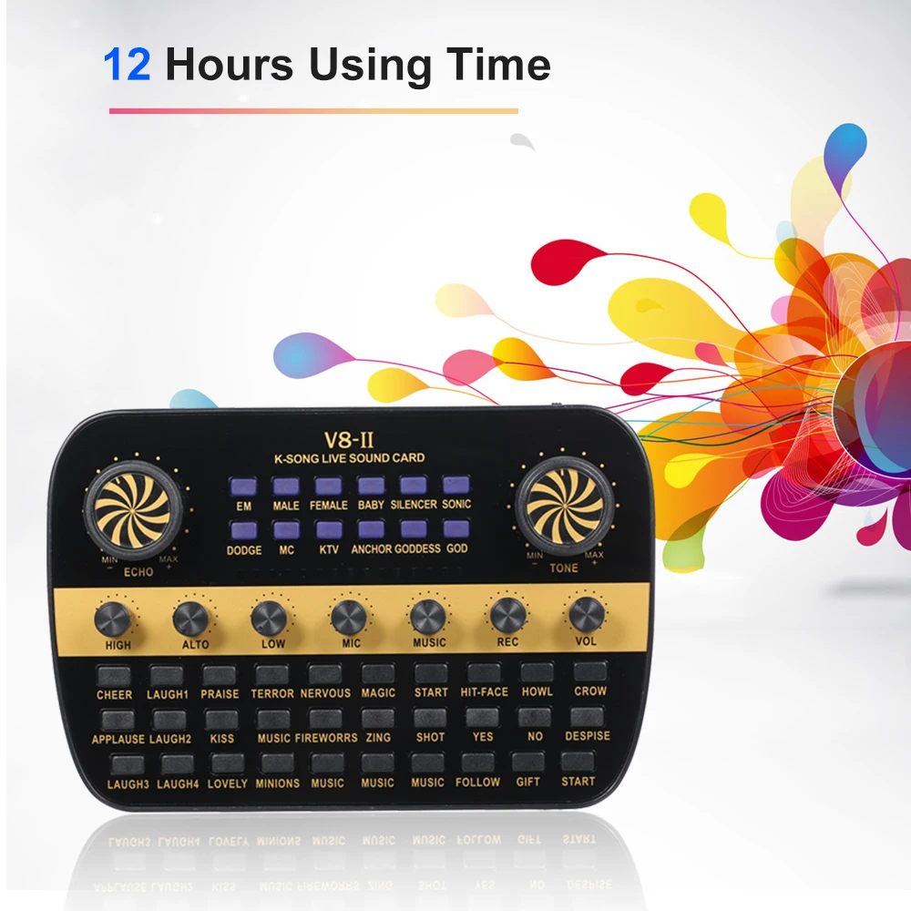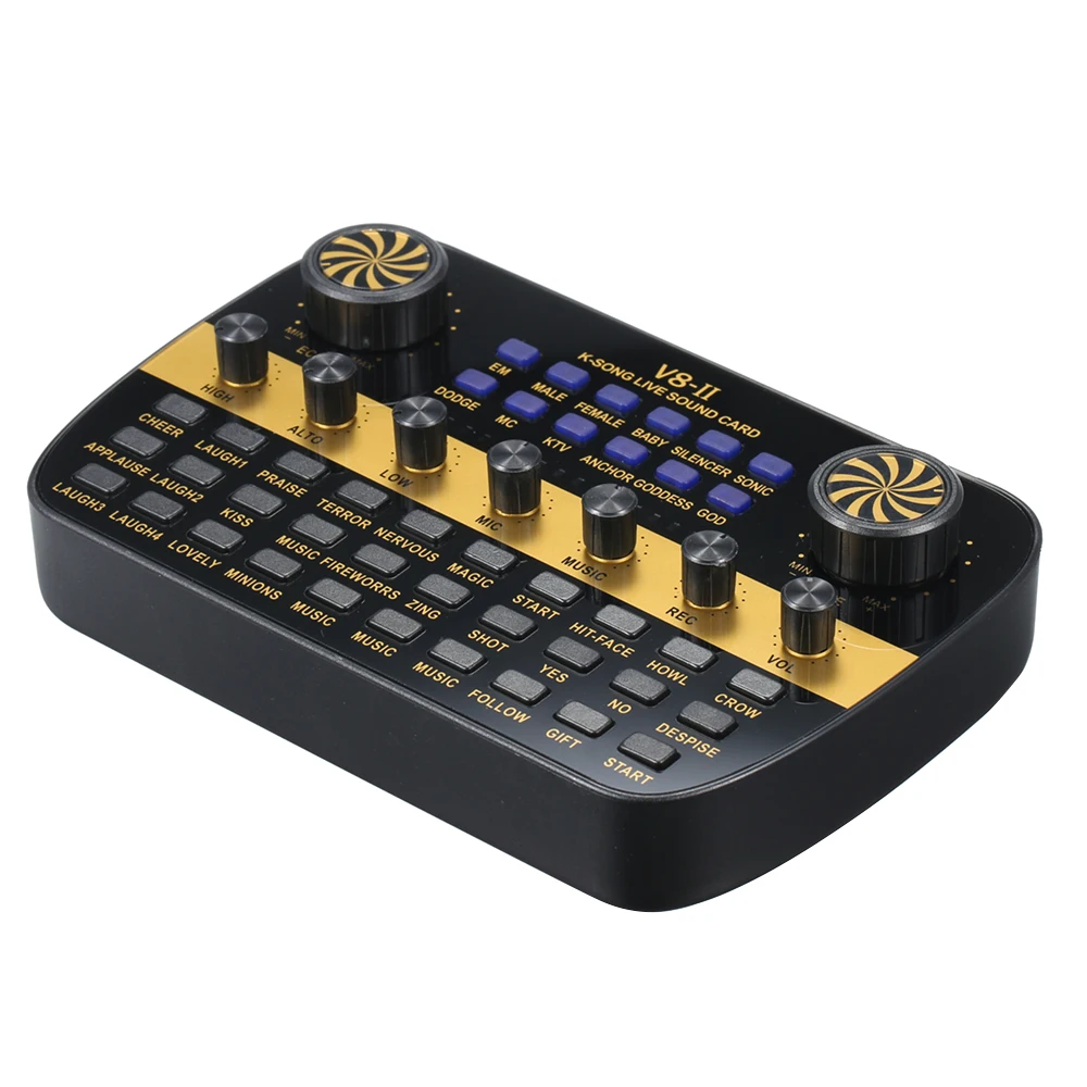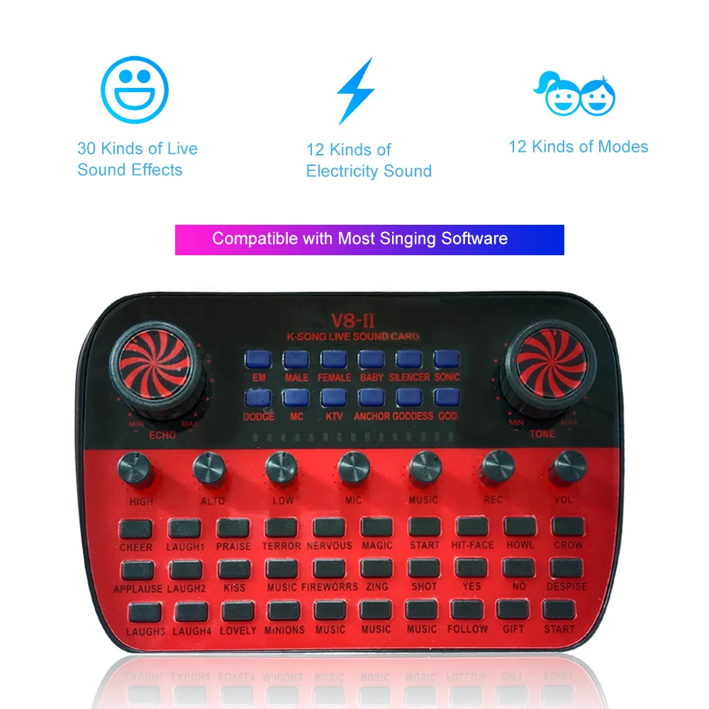 Эта многофункциональная живая звуковая карта имеет 30 видов живых звуковых эффектов, 12 видов звукового сигнала электричества и 12 видов режимов, которые могут удовлетворить ваши различные потребности.