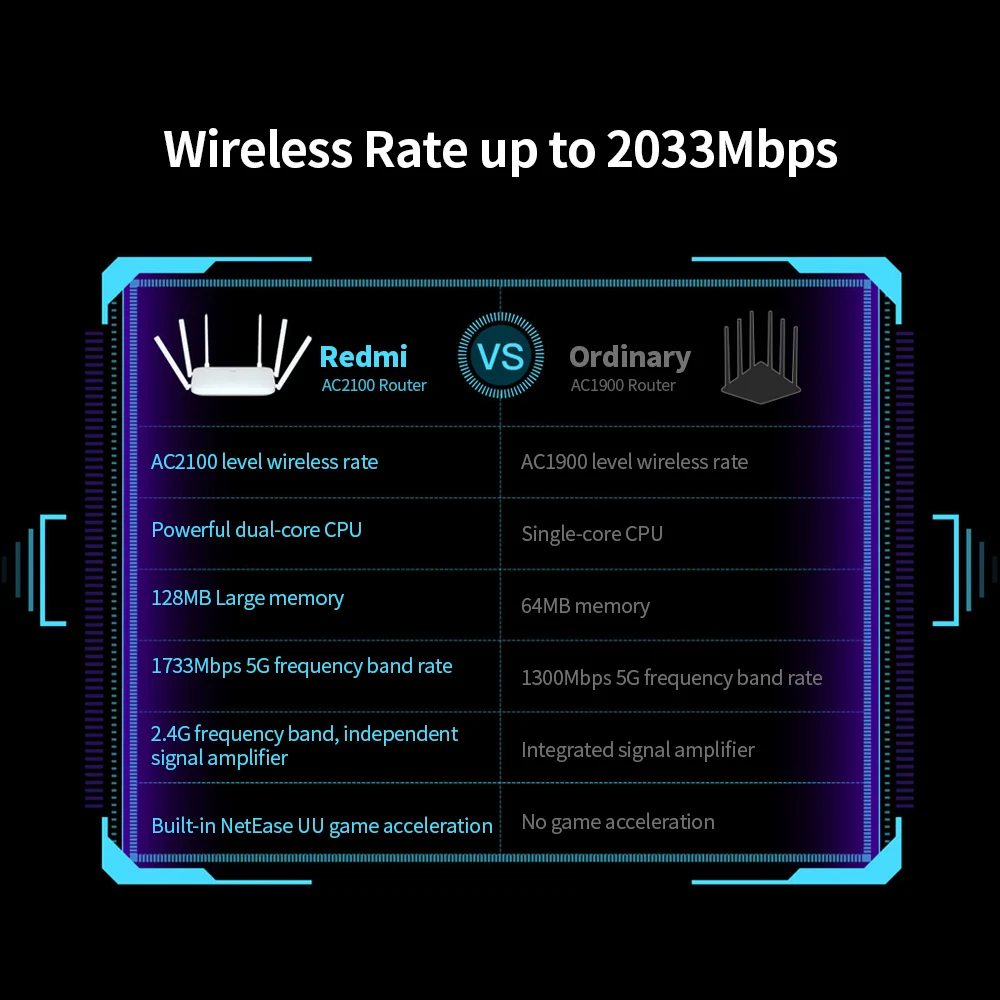 Маршрутизатор оснащен двумя частотными диапазонами 2,4 ГГц и 5 ГГц, Двухдиапазонная Беспроводная скорость передачи данных до 2033 Мбит/с. Он имеет меньше помех и высокую скорость, более гладкий, чтобы смотреть HD видео и играть в онлайн-игры.
