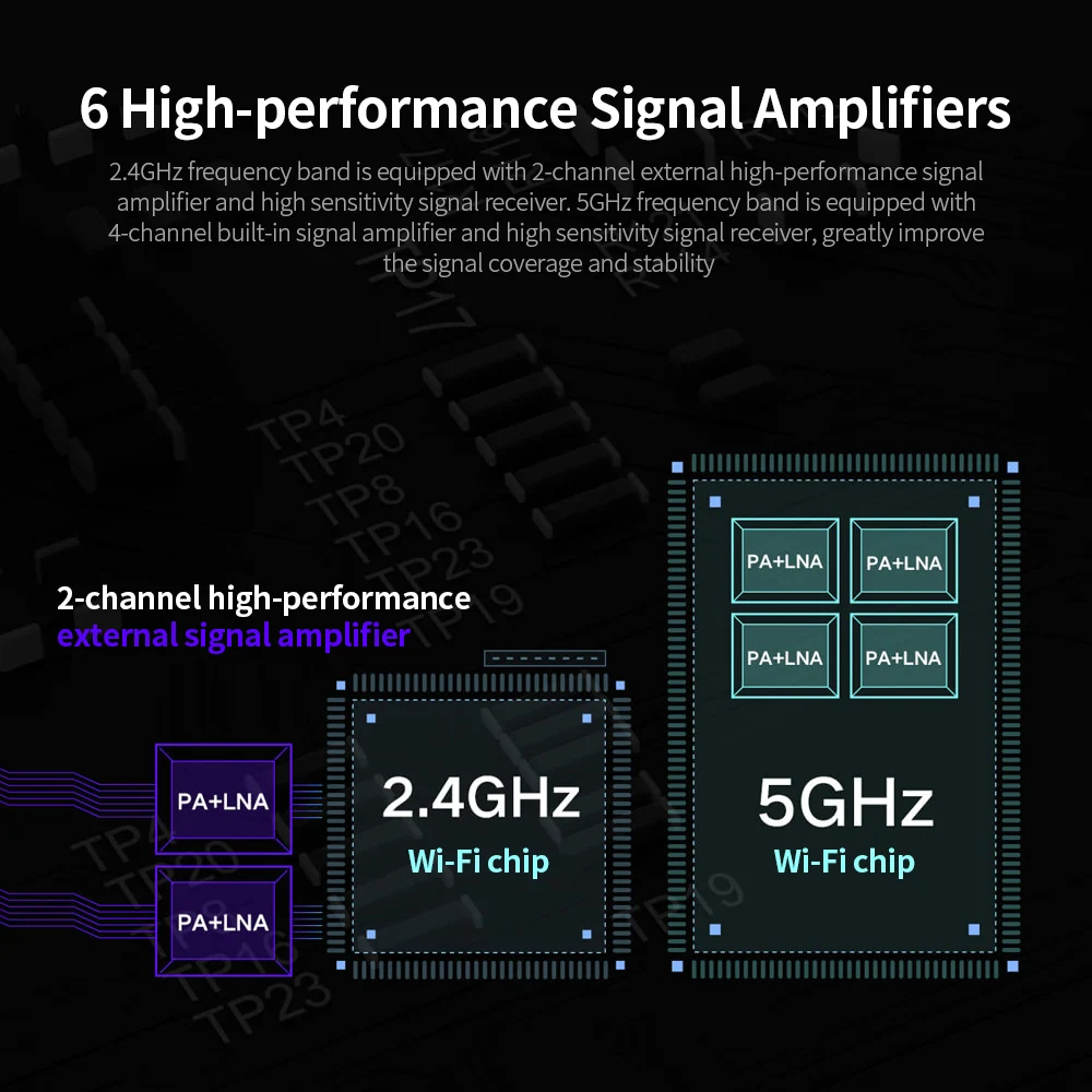 Частотный диапазон 2,4 ГГц оснащен 2-канальным внешним высокопроизводительным усилителем сигнала (PA) и высокочувствительным приемником сигнала (LNA). Частотный диапазон 5 ГГц оснащен 4-канальным встроенным высокопроизводительным усилителем сигнала и высокочувствительным приемником сигнала. Значительно улучшает охват сигнала и стабильность, легко справляется с различными сложными сетевыми условиями.