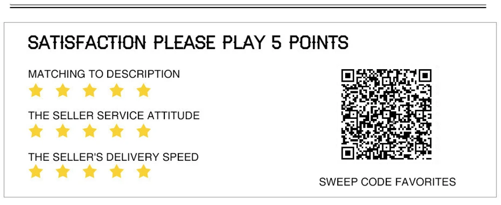 Отзывы: 1. Если вы довольны нашим товаром и обслуживанием, пожалуйста, оставьте положительный отзыв и оценку в 5 звезд. 2. Если вы не довольны нашими товарами, пожалуйста, свяжитесь с нами, прежде чем оставить негативный отзыв. Мы гарантируем, что мы будем 100% решить любую проблему для вас и сделать вас удовлетворенными. 3. Мы заботимся о наших уважаемых клиентах и всегда будем стараться вам помочь, надеемся установить с вами долгий бизнес. 4. Пожалуйста, свяжитесь с нами через TRADEMANGGER, прежде чем оставлять любые негативные отзывы или открывать спор на сайте. Пожалуйста, дайте нам возможность разрешить любую проблему.