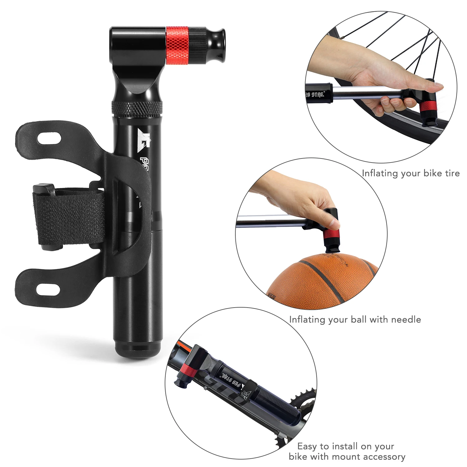 Двойная головка клапана совместима с клапаном Presta и Schrader. Легкий и портативный дизайн с креплением для легкой установки.