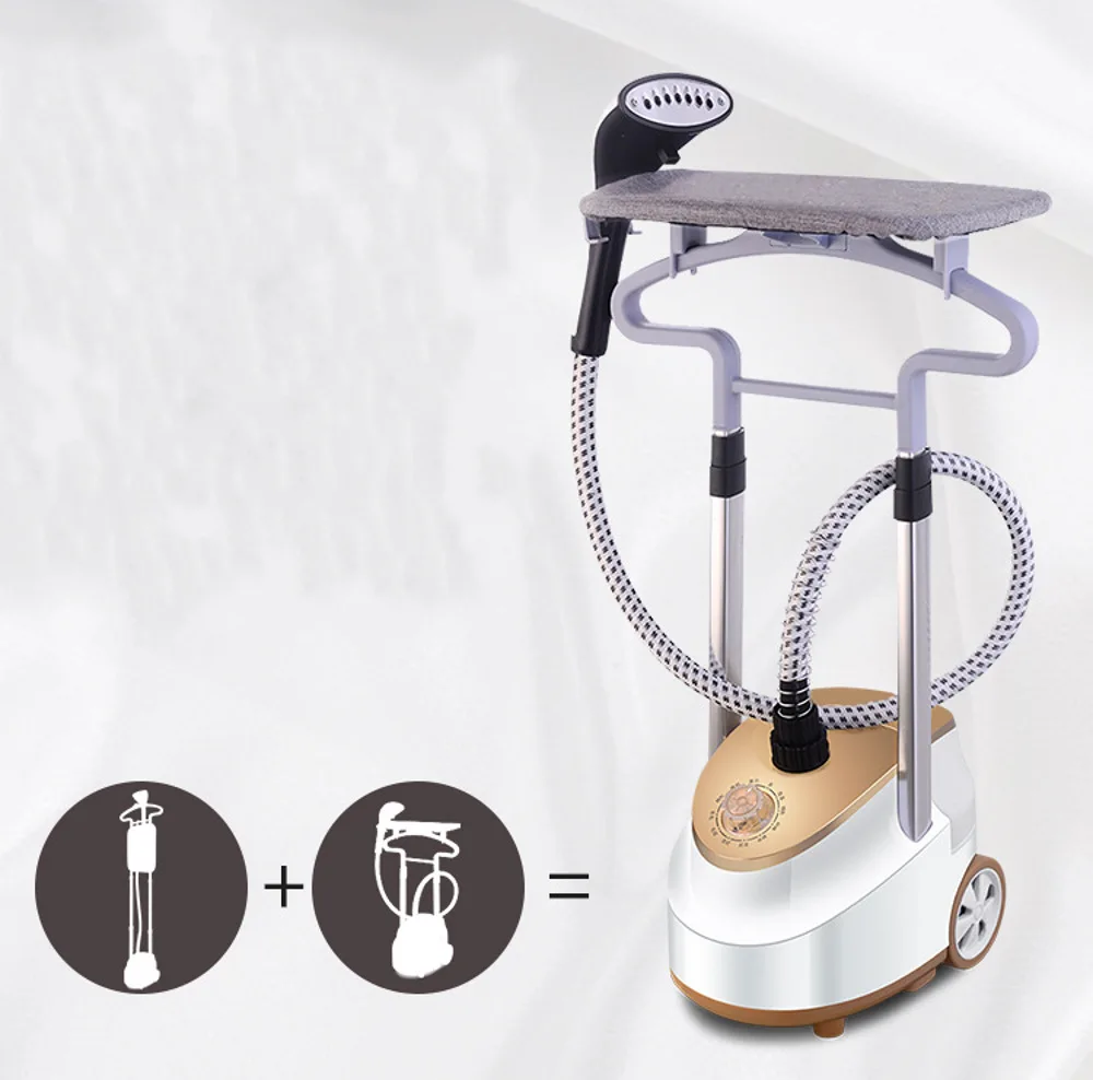 Встроенная гладильная доска и регулируемые шесты: встроенная гладильная доска может быть отрегулирована под любым углом, подходит для вертикального парения и горизонтальной глажки. Телескопические палки регулируются для удобства использования и сползают для хранения, в то время как встроенная вешалка для одежды и брюки нажмите зажим с тканевой щеткой держит одежду в положении во время парения.