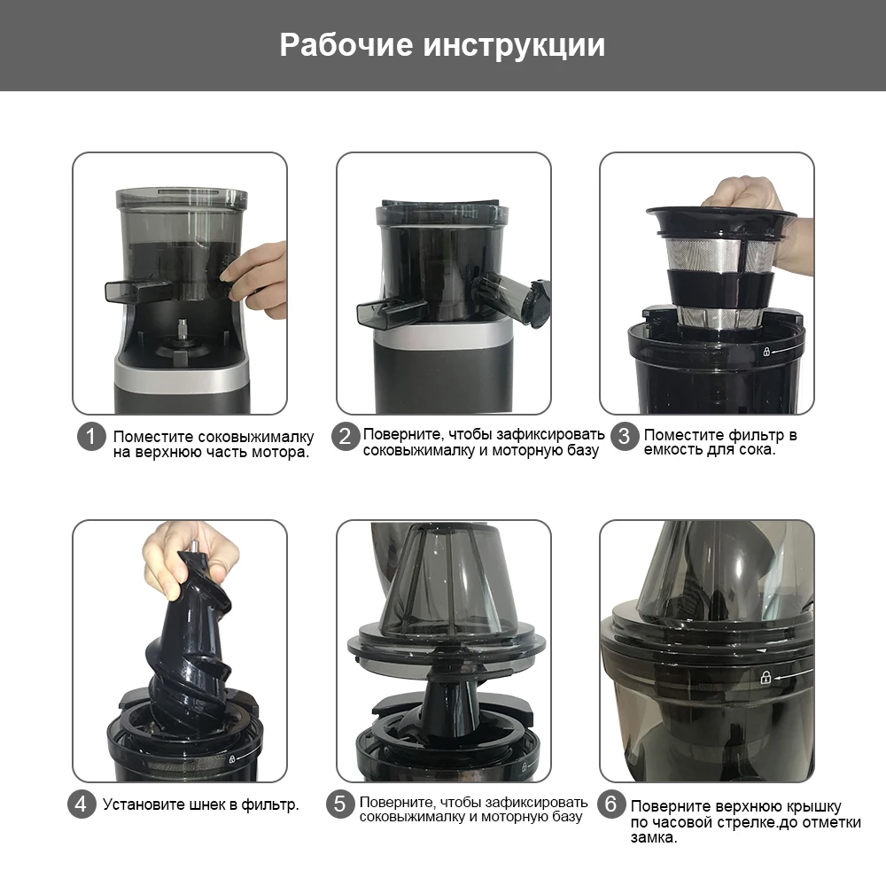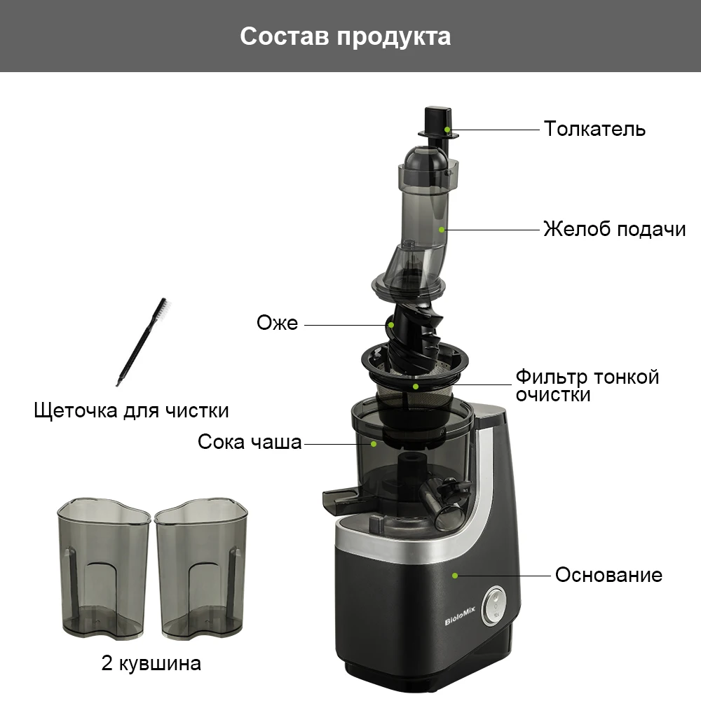 Ультра эффективный: 200W специализированных асинхронного двигателя переменного тока измельчает самые жесткие ингредиенты с легкостью, вырабатывают меньше шума, вибрации и отвлекающих факторов. Работа с более низкой скорости (40-65 оборотов в минуту), которая хорошо подходит для сохранения Пищевая ценность фруктов, овощей и зелени.