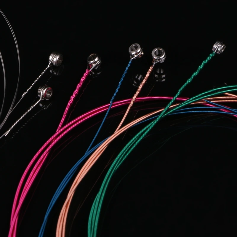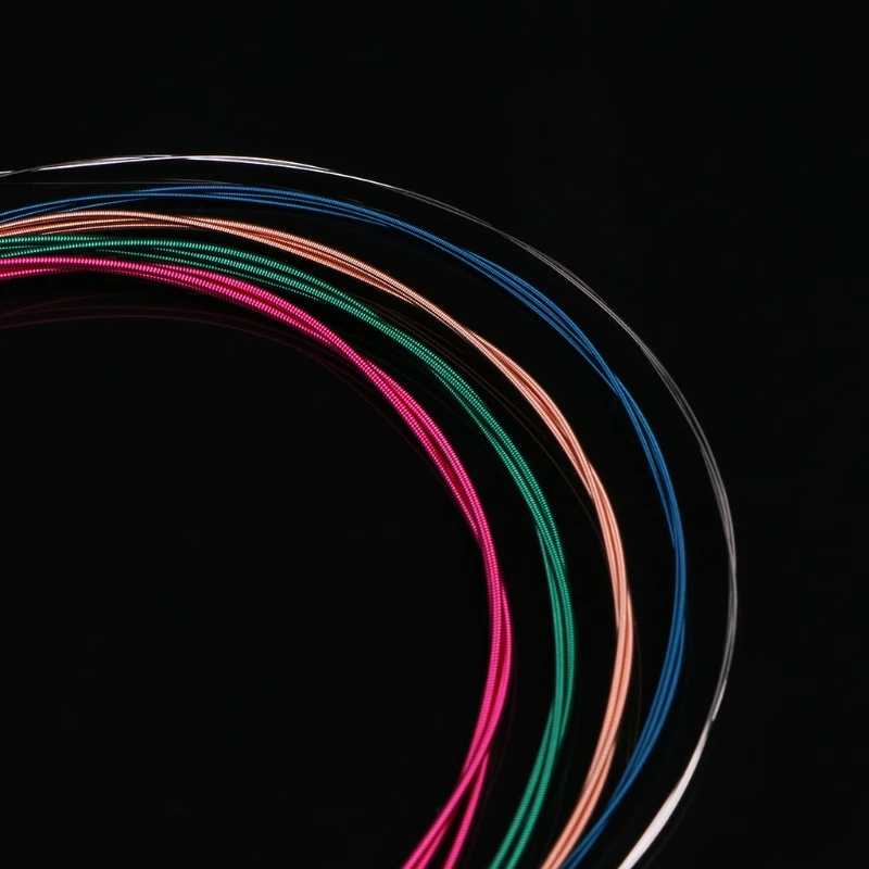 E string (1st)-нержавеющая сталь 0,28 мм, B string (2nd)-нержавеющая сталь 0,33 мм, G string (3rd)-синяя бронзовая ранка 0,63 мм, D string (4th) 0,78 мм зеленая бронзовая ранка, веревка (5)-0,93 мм желтая бронзовая ранка, E string (6) 1,29 мм красная бронзовая ранка.