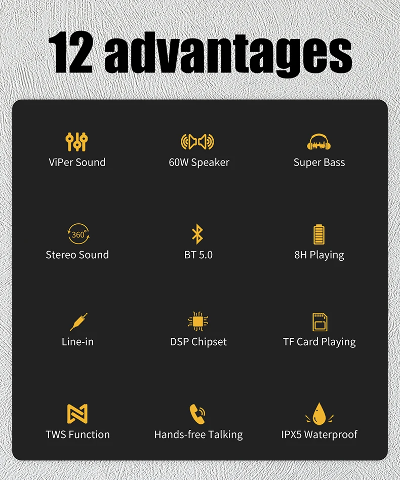 Модель: X8 Версия Bluetooth: 5,0 Выходная мощность: 60 wrms Водонепроницаемый IPX5 Голосовой помощник поддержка Поддержка 3 режима музыки Поддержка Торговая платформа функции 3 режима воспроизведения: Bluetooth/tf-карта/Дополнительный вход Поддержка музыкального формата: mp3, flac, wav Частотная характеристика: 100 Гц-20 кГц Отношение сигнал-шум: 9090db Батарея Тип: лития ионный полимерный аккумулятор (3,7 в 6600 мА · ч) Время зарядки аккумулятора: 3 часа Источник питания: Type-C 5 В/2.1A Время воспроизведения музыки: от 8 до 15 часов (различный объем и аудио) Габариты (в×ш×г): 220 × 95 × 72 (мм)/8,7 "× 3,7" × 2,8" Вес динамика: 860 г Что в коробке? 1 X8 динамик 1 кабель типа C 1 * AUX кабель 1 * Руководство пользователя