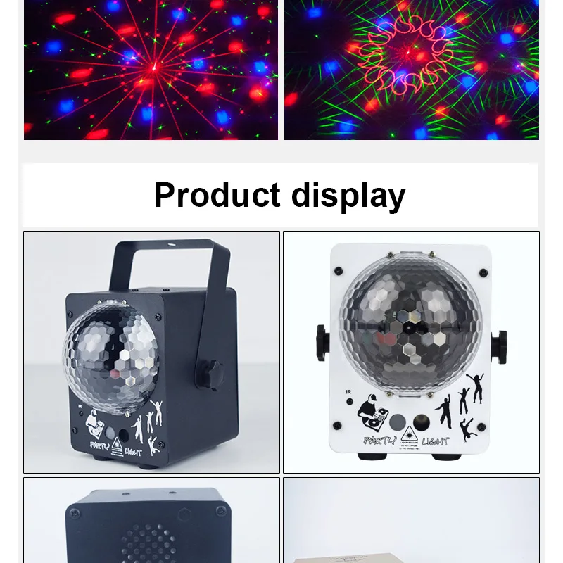 Specifications: Product Name: new Bluetooth 60 pattern laser light + LED magic ball light Laser: red:100mw green:30mw Patterns: 60 Control: automatic/voice/remote control Volt: DC 5V2A Power: 5W G.W: 0.9kg Packing size: 22.2 * 13.6 * 14.6cm