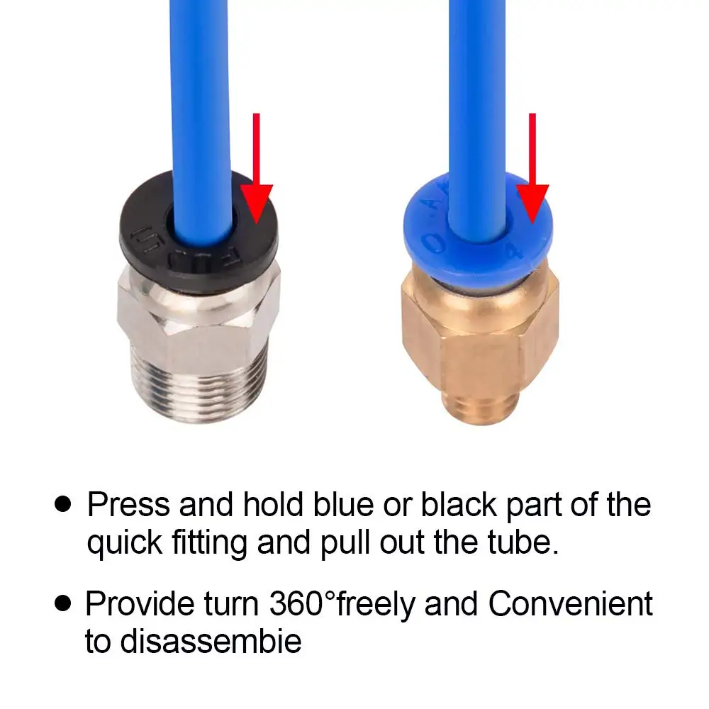 PTFE синяя трубка-синий цвет тефлоновая трубка наружный диаметр 4 мм, внутренний диаметр 2 мм, плотность 2,15-2,20 г/см3 PC4-M6 фитинги-Резьба M6/3 мм, Внутренний диаметр (синий конец) 4 мм, подходит для трубки, внешний диаметр которой составляет 4 мм PC4-M10 фитинги-резьба M10/6 мм, Внутренний диаметр (черный конец) 4 мм, подходит для трубки, внешний диаметр которой составляет 4 мм Премиум-материал-тефлоновая трубка изготовлена из прочного PTFE (поли тетра фторэтилена) материала, PC4-M6 фитинги изготовлены из меди; PC4-M10 фитинги изготовлены из нержавеющей стали Внимание-маленькие аксессуары для 3D-принтера, пожалуйста, держите подальше от детей