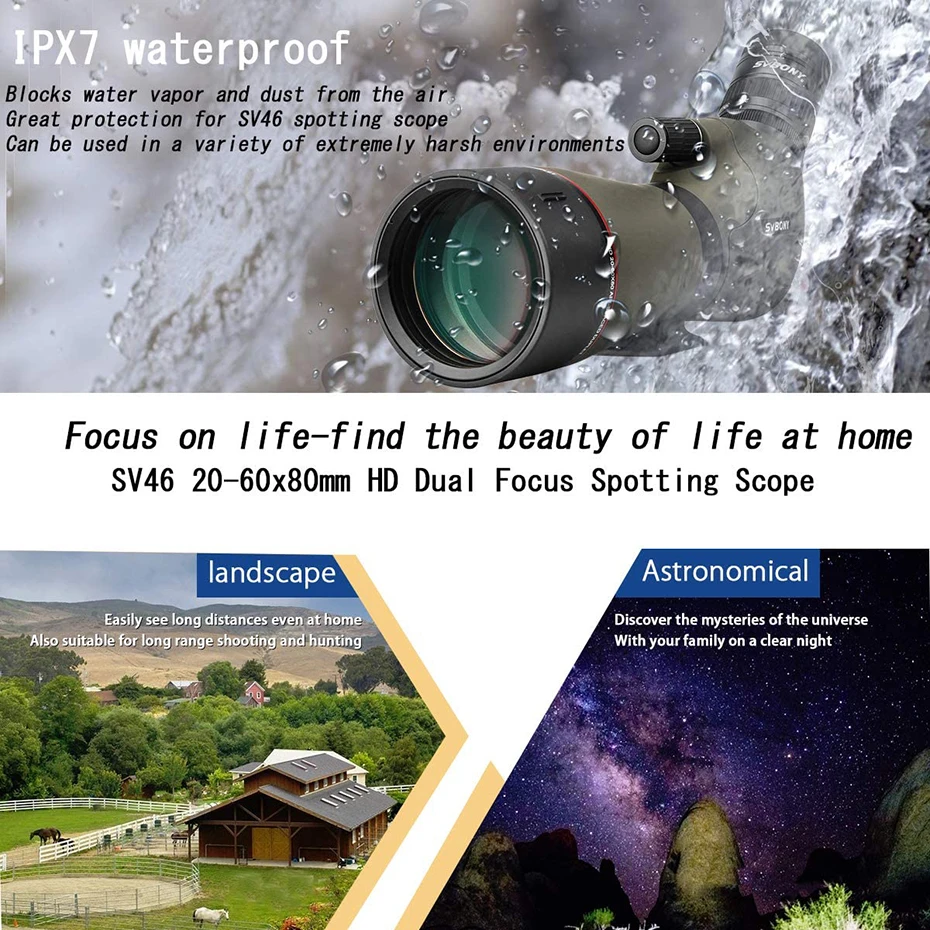 7.Metal Sunshade: reduces glare and shields the objective lens from raindrops