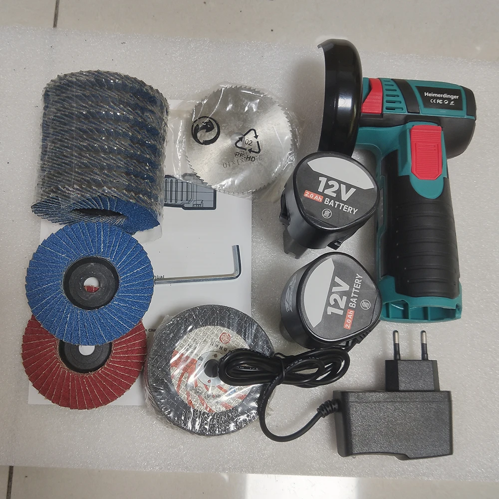 Комбо с: (1). 1x Бесщеточный Мини-шлифовальный станок/корпус режущего станка (2). 2x12V 2000 mAh аккумулятор. (3). Зарядное устройство-1 шт. (4). Режущее лезвие: 25 алмазная пила 1 x HSS пила 10 x польский пильный диск (красный/черный/зеленый/синий цвет)