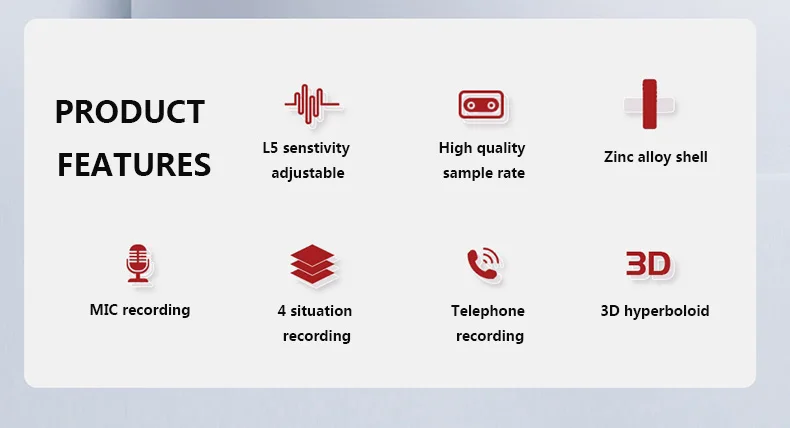 1. С использованием цельного сплава цинка, анти-падение сильно 2. Отметка времени, имя записи файлов по дате автоматически 3. Запись таймера и включение в установленное время 4. Отслеживайте Запись в реальном времени/слуховой аппарат fuction 5. Диктофон, MP3 и телефонная запись, 6. Функция воспроизведения: Поддержка циклической записи, A-B функция повтора сегментов 7. Встроенные высокоточные динамики, прямой внешний звук 8. Поддержка проверки оставшегося времени записи 9. Микрофон для записи 10. Встроенные высокоточные динамики, прямой внешний звук 11. Поддержка Голосовая активация режима 12. Обнаружение низкого заряда батареи и автоматическое сохранение файлов записи 13. Встроенная перезаряжаемая литиевая батарея 300 мАч 14. Один ключ для записи, поддержка записи голосового управления. 15. С функцией включения пароля для защиты данных в устройстве 16. Функция автоматического обнаружения и защиты с низкой мощностью, режим ожидания в течение 2 минут автоматически отключается. 17. Цвет: черный