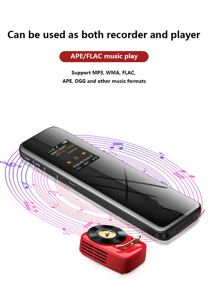 1. Формат записи: WAV/MP3 2. Формат воспроизведения музыки: WMA/FLAC/MP3/APE/OGG и т. Д. 3. Время записи батареи: около 35 часов 4. Батарея: литиевая батарея 300 мАч 5. Объем памяти: от 8 Гб до 128 Гб (зависит от фактического продукта) 6. Режим петли: нормальный, случайный, все, одиночный цикл 7. Метод записи: Запись голоса, запись телефона 8. Качество записи: 1536 кбит/с, 1024 Кбит/с, 768 кбит/с, 512 кбит/с, 192 кбит/с, 128 кбит/с, 64 Кбит/с, 32 кбит/с 9. Интерфейс USB: Type-C 10. Рабочая температура: от 0 до 45 градусов 11. Разъем для наушников: 3,5 мм, двойной трек 12. Коэффициент шума: 80 дБ 13. Размер (мм): 99*27*9,6 (Д * Ш * т) (специфично для фактического продукта) 14. Вес нетто: 41 г 15. Совместимая система: Windows 2000 и выше 16. Использование для: ежедневных, встреч, тренировок, дальних расстояний