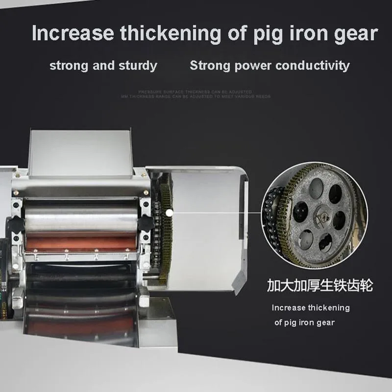 Машина использует цепной привод, что делает диапазон нажимного ролика большим регулируемым зазором. Самое большое преимущество этой машины в том, что скребковый нож может двигаться синхронизированно с нажимным роликом, чтобы лапша была гладкой и приятной; уменьшите истирание ролика и Продлите срок службы машины, чтобы удовлетворить потребности высококачественных пользователей. Прижимная поверхность, месить машину двойного назначения. Аппарат прост в использовании, красивый внешний вид, высокая эффективность, корпус с железным распылением, в соответствии с национальными стандартами здоровья, подходит для отелей, ресторанов, пищевых заводов, столовых и индивидуальной гастрономической лапши