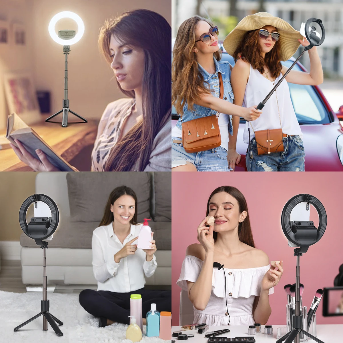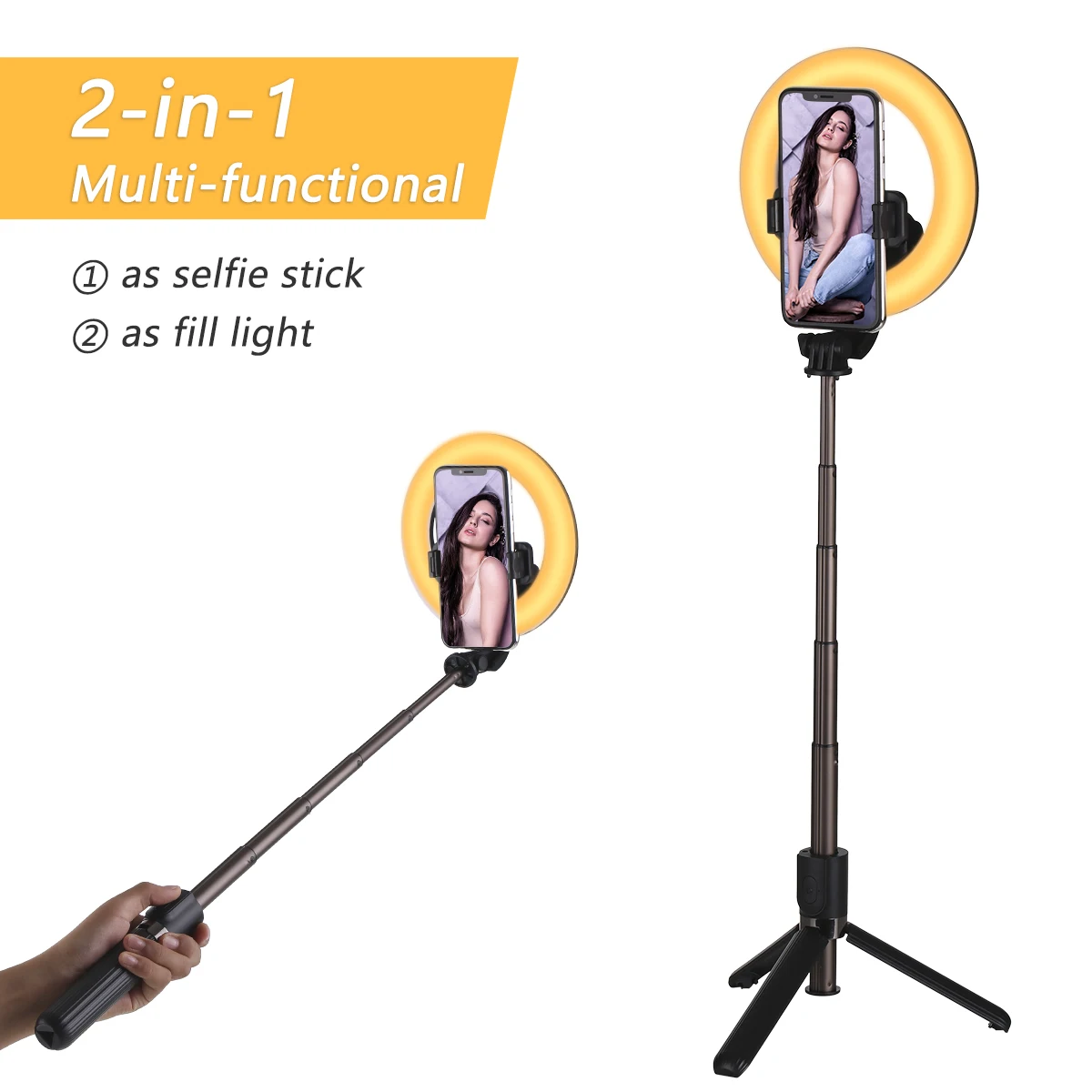 Конструкция «2 в 1 сочетает в себе selfie stick и ringlight вместе, он также может быть использован как настольная лампа для чтения.