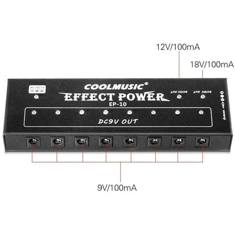 10 изолированных выходов, 8x9v 300ma, 1x12v 500ma и 1x18v 500ma для всех эффектов гитары на батарейках.