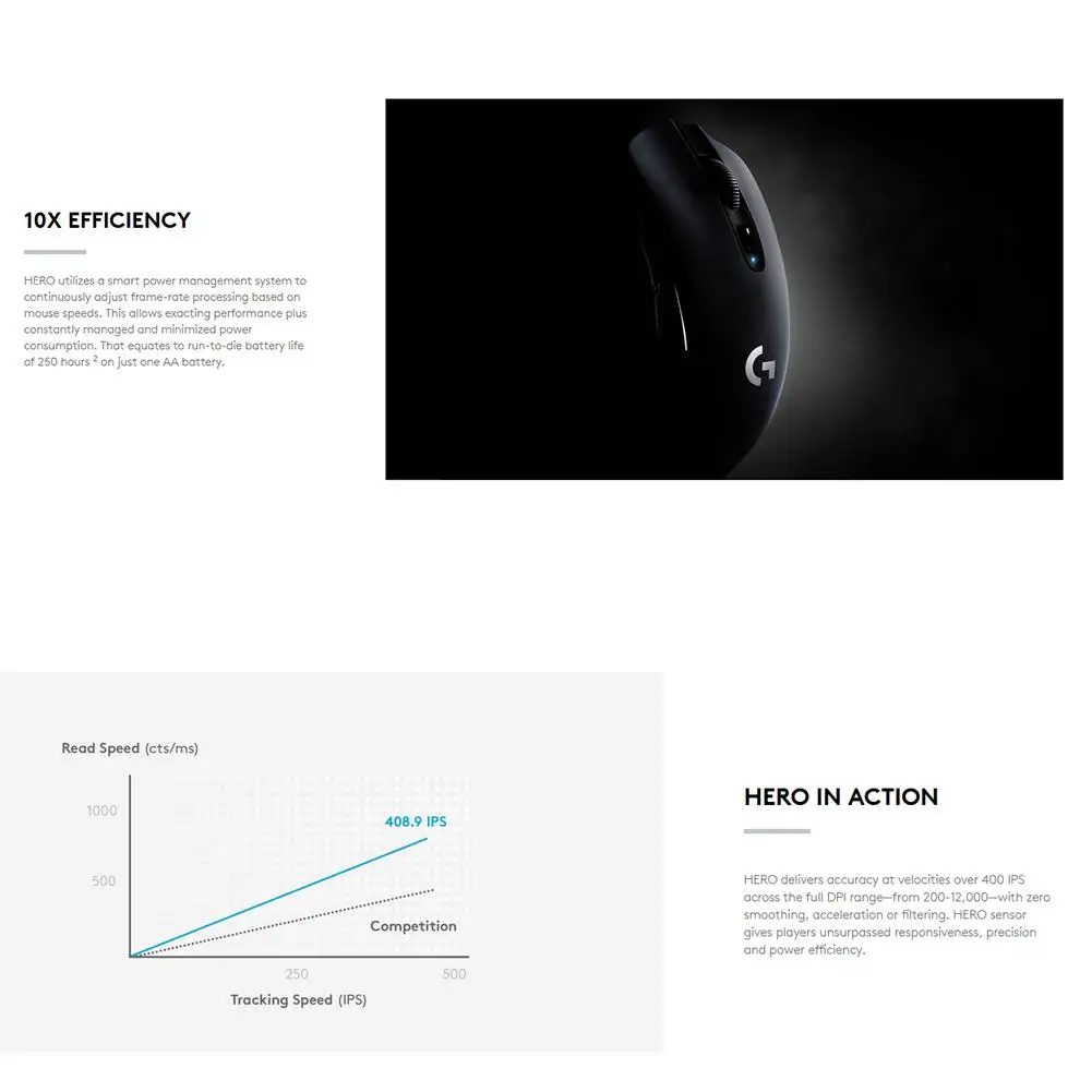 HERO-это революционный новый оптический датчик, разработанный Logitech G, обеспечивающий лучшую производительность в 10 раз больше энергоэффективности (по сравнению с предыдущим поколением). Датчик HERO обеспечивает исключительно точную и стабильную производительность с нулевым сглаживанием, фильтрацией или ускорением от 200 до 12 000 DPI. G304 может сохранять до 5 профилей с уровнем до 5 DPI каждый на встроенной памяти.