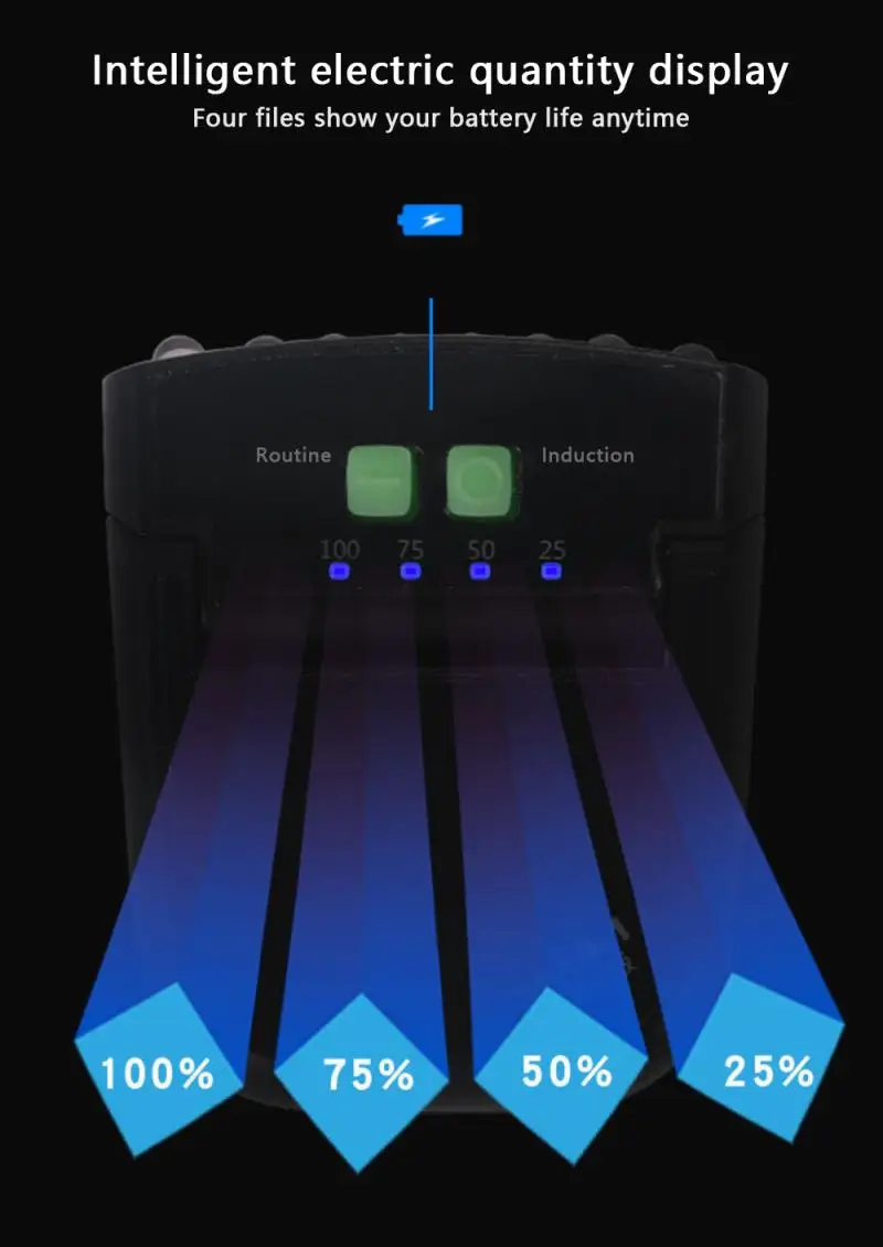 4. Налобная лампа может вовремя отображать мощность налобной лампы, она будет отображать четыре уровня: 100%, 75%, 50% и 25%, чтобы вы могли узнать мощность в любое время.