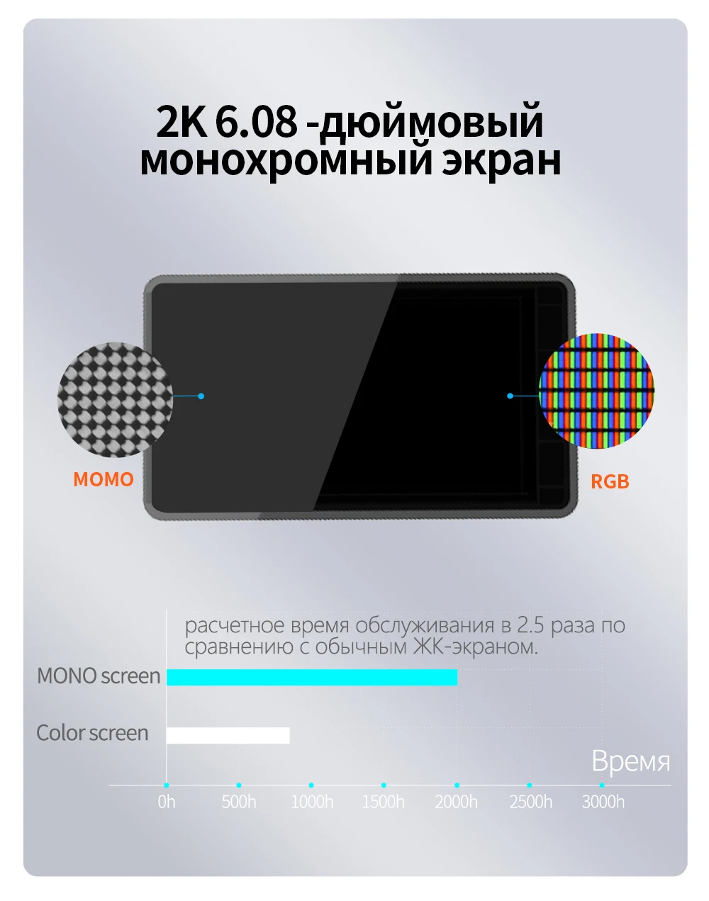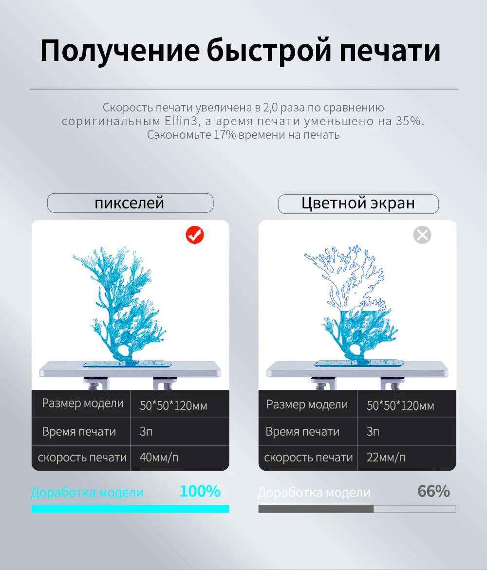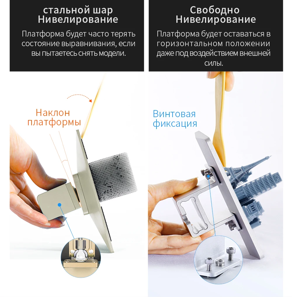 Технология: ЖК-дисплей 405nm Высота слоя: 0,025-0,100 мм X/Y точность печати: 0,05 мм Скорость печати: 18-39 мм/ч Объем сборки: 130*75*150 мм