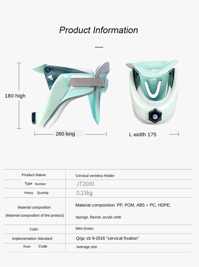 Название продукта: шейный держатель позвонка Состав материала: PP, POM, ABS + PC, HDPE, губка, фланель, акриловая ткань Цвет: мятно-зеленый Стандарт выполнения: Q/gz xb 9-2016 'шейный отдел" Код линейки: средний размер