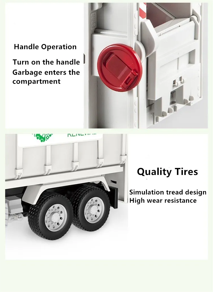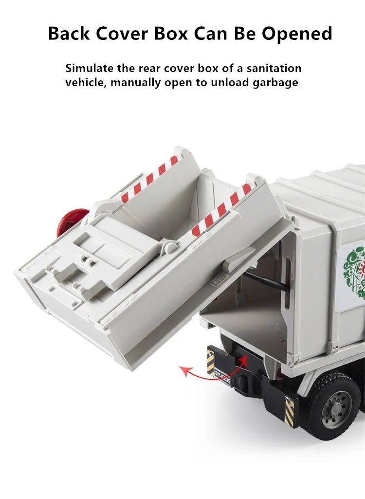 Мусорные ящики поднимаются и опускаются, а отсек для санитарных грузовиков заполнен мусором и транспортируется в указанное место, которое может быть поднято, Чтобы выгрузить мусор