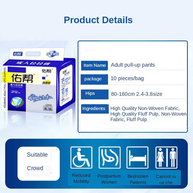 Основные характеристики: 1. Белая PE пластиковая Водонепроницаемая подкладка 2. Мягкий поверхностный слой, тканевая задняя панель, комфортные ощущения от руки 3. Супер Поглощение, Блокировка воды, сохраняет кожу сухой 4. Тип брюк, легко надевать и снимать 5. Принимает полимерные абсорбирующие и пушистые целлюлозы; Водопоглощающая структура, с сильной поглощающей способностью! 6. Он может много раз поглощать мочу и другие жидкости для тела, чтобы сохранить поверхность меняющейся подкладки сухой. 7. Быстро впитывает фекалии и удаляет неприятные запахи для обеспечения свежего воздуха в помещении. 8. Простота в использовании, охрана окружающей среды и санитария.