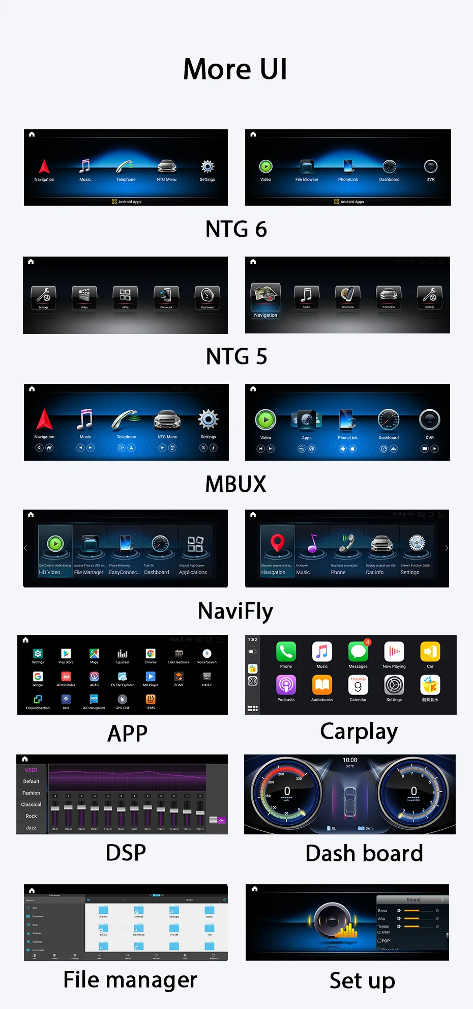 Двойная система преобразования, оригинальная система Mercedes Benz NTG и система Android. Поддерживает все оригинальные функции NTG, такие как заводское радио, gps-навигация, bluetooth, DVD/CD,USB,SD и т. д., поддержка заводской камеры заднего вида обратного траектории., 360 камера, дверная открытая warnig, совместима с оригианским джойстиком, сенсорной мышью и управлением рулевым колесом, совместима с оригинальной звуковой системой и оптическим волокном, воспроизведение звука без потерь. Новые модели и новый пользовательский интерфейс, больше напоминающий оригинальный автомобильный стиль, более стильный