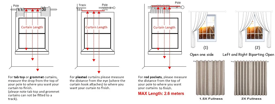 Ширина штор = 2xA (2 части стержня или ширина дорожки). Для всего окна лучше две панели.