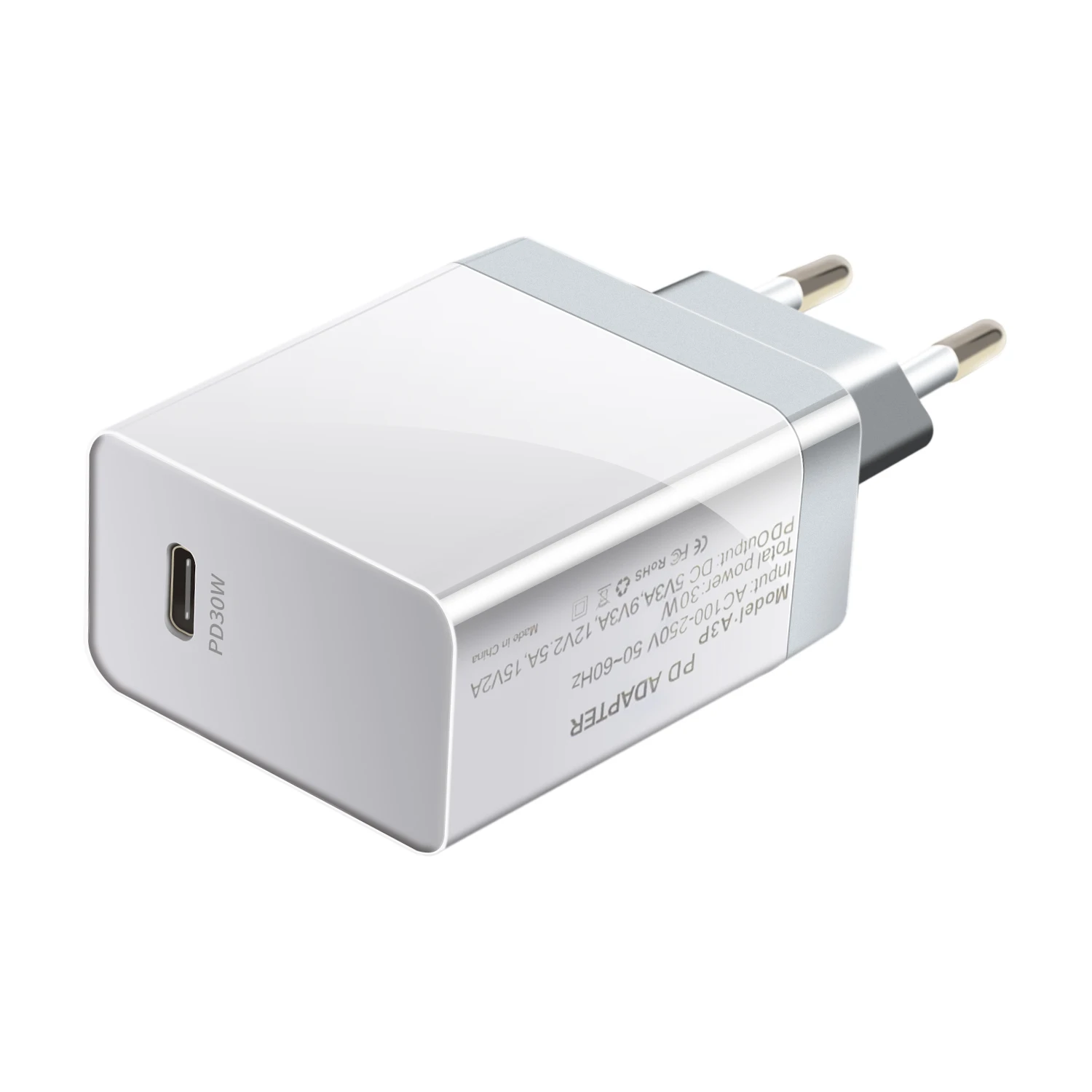 Specification parameters: Product name: PD30W Travel Charger. Product Model: A3P. Product size: 55.3*45.5*27.3mm. Voltage input: AC100-240V 50-60Hz. PD output voltage: 5V/9V/12V/15V. PD output power: 3.0A/3.0A/2.5A/2.0A. Output power: 30W. Automatic identification: automatic identification of voltage and current according to equipment. Material: PC+ABS fireproof and flame retardant. Color: White Package: 1*Charger ( US/EU plug)