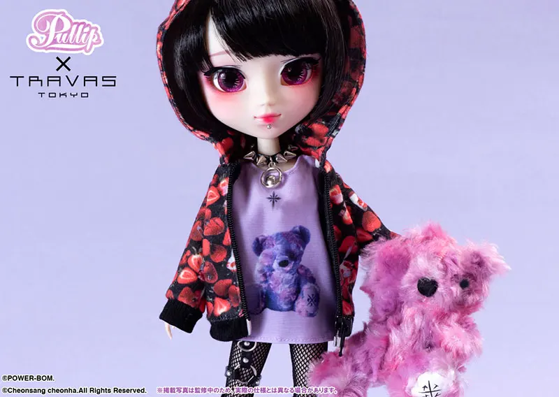 -Японский модный бренд Travas Tokyo x Pullip Collaboration. -Концепция бренда Travas Tokyo, которая позволяет вам увидеть некоторые садистские стороны в симпатичном дизайне, была погружена в дизайн куклы Pullip. Аксессуары; Плюш Кума (медведь), чокер, пояс для подвязки, повязка на глаза, маска, кукольная подставка Комплект поставки: толстовка с капюшоном, футболка, короткие штаны, колготки, гольфы, сапоги, чокер, пояс-подвязка, повязка на глаза, маска, серьги.