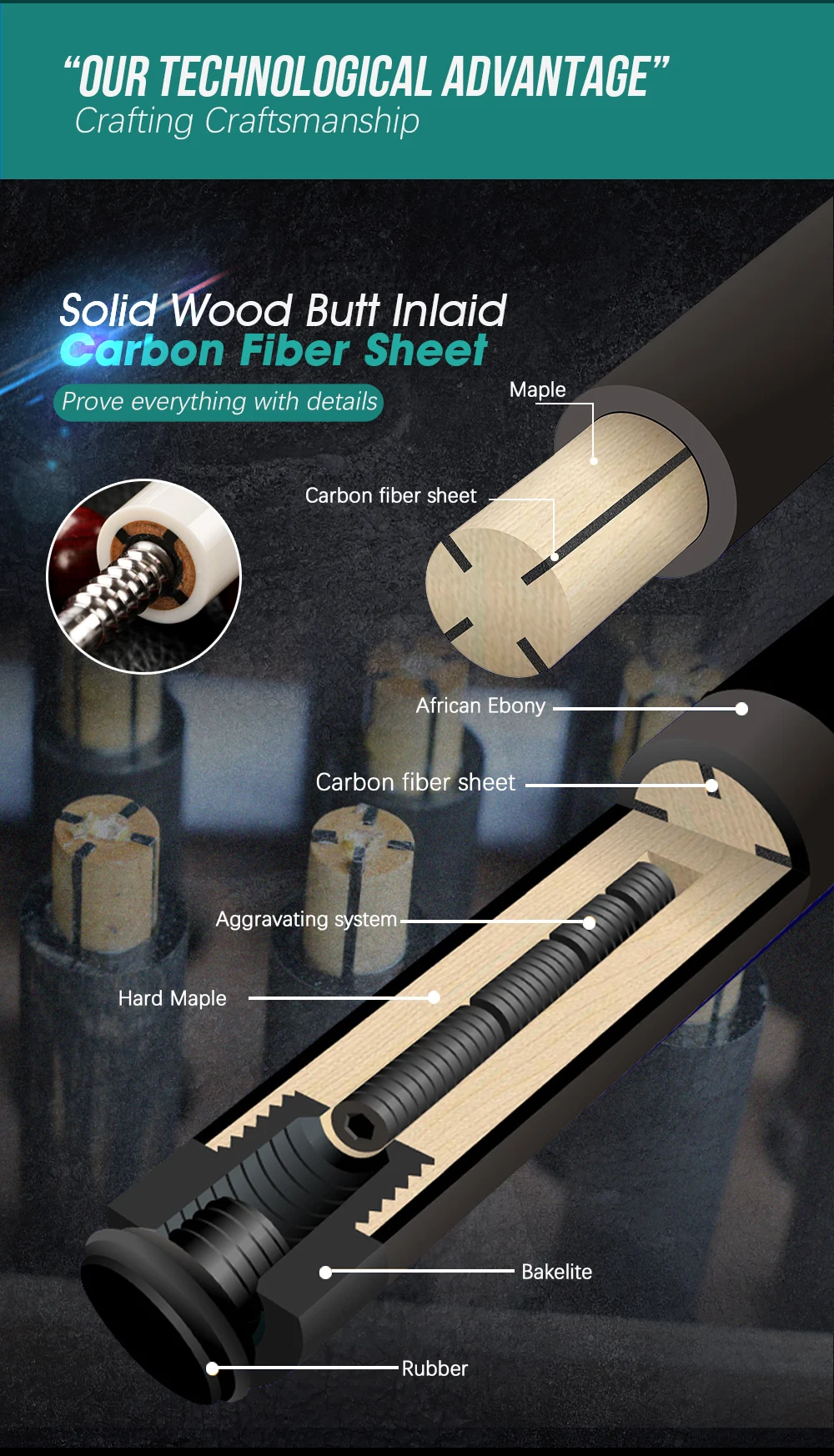 1.Solid Wood Butt Inlaid Carbon Fiber Sheet 2.Butt Unique Pattern Design 3.Hardness Comparable to Tempered Glass 4.3/8*8 Radial Pin,High strength, not easy to damage, self-locking ability 5.Carbon Fiber Shaft,Good hardness, sufficient strength, no deformation, no cracking, no fear of bumps
