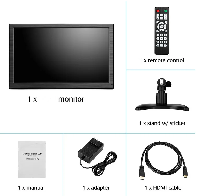 Package Including: 1x 10'' IPS Monitor 1x Power Adapter 1x HD Cable 1x BNC Cable 1x VGA Cable 1x Manual 1x Remote Controller 1x Base