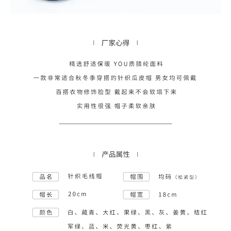 Информация о продукте Название: зимняя однотонная вязаная шапка Материал: акрил Длина шапки: 21 см Ширина крышки: 20 см Окружность головы: 56-58 см (эластичная)