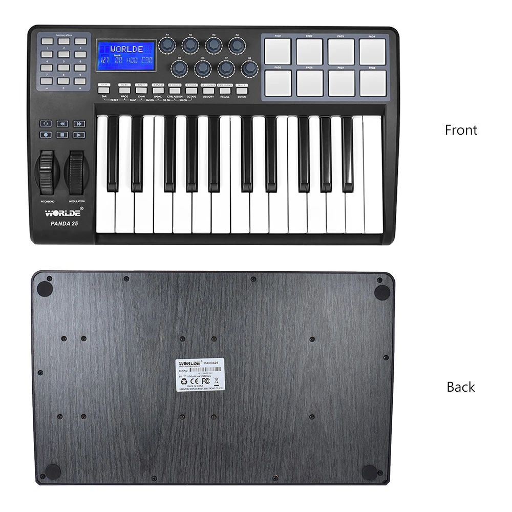 Контроллер клавиатуры USB MIDI с 25 настраиваемыми кнопками, чувствительными к скорости.