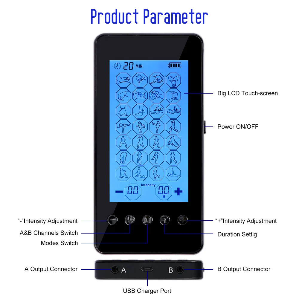 • Помогает снять небольшие нервы и мышечные боли. Он состоит из двух основных компонентов, а именно: транскутанный электронный стимулятор нерва и электронный мышечный Стимулятор/приведенный в действие мышечный Стимулятор, который генерирует необходимые сигналы стимуляции, и 2 набора проводов с электродными прокладками.