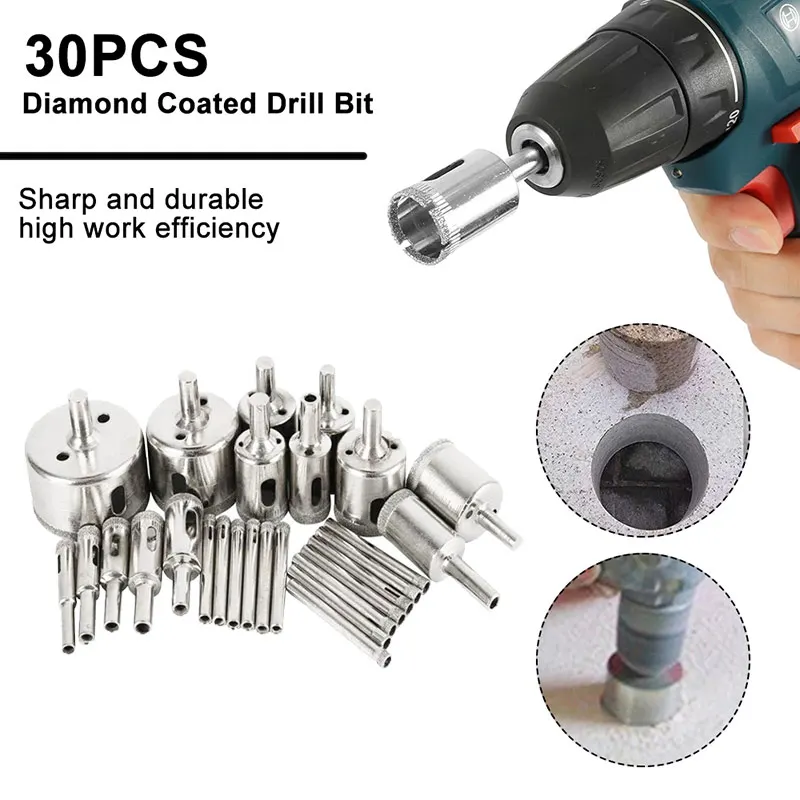 Характеристики: Материал: EmerySize: 6/8/10/12/14/16/18/20/22/25/28/30/35/40/45/50 мм Количество: 30 шт. включает: 15 шт. * 6 + 8/10/12/14/16/18/20/22/25/28/30/35/40/45/50 мм * 1 Применимая промышленность: особенности обработки керамики: острый и прочный, высокая эффективность работыУпаковка: 30 х сверл для кольцевой пилы