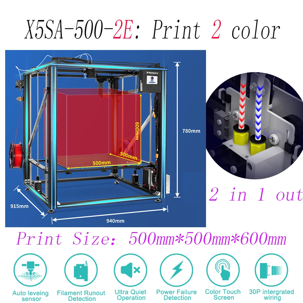 Можно напечатать два цвета одновременно Размер печатной модели: 500 мм * 500 мм * 600 мм
