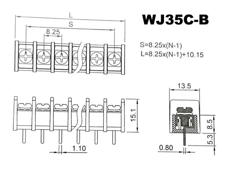 Материал Винты: M3 сталь оцинкованная Штыревой разъем: латунь, Оловянное покрытие Корпус: PA66, UL94V-0 Электрические Номинальное напряжение: 300 В Номинальный ток: 20A Контактное сопротивление: 20mΩ Сопротивление изоляции: 5000M Ω/DC500V Выдерживаемое Напряжение: переменный ток 2000 В/1 мин Диапазон проводов: 22-12AWG 2.5mm2 Механический Диапазон температур:-40 ℃ ~ + 105 ℃ Крутящий момент: 0.5нм (4.4lb.in) Спецификация Шаг: 8,25 мм Полюсы: 2P/3P-24P