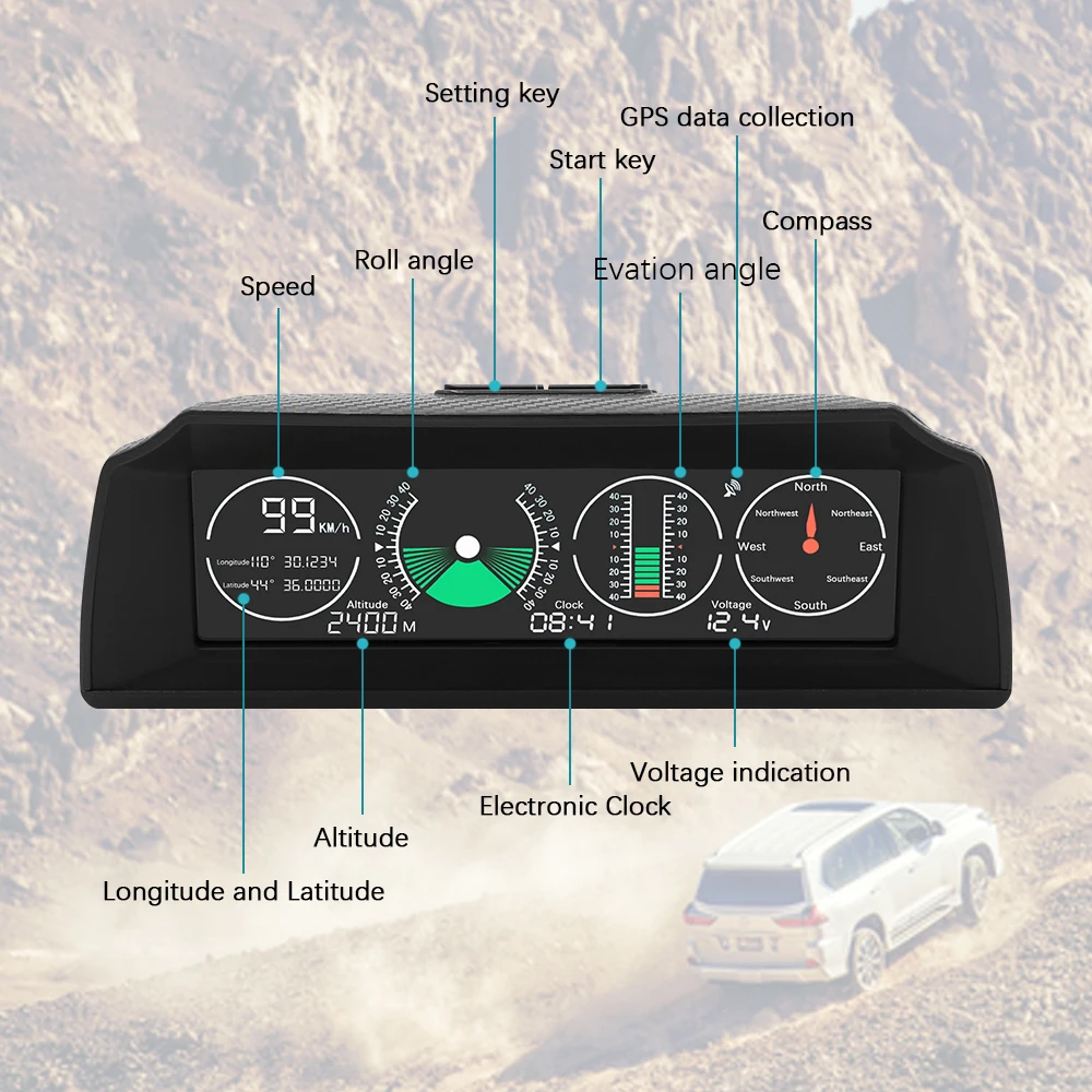 Умный GPS многофункциональный горизонтальный спидометр для вождения, полностью поддерживает Высокоточный Мониторинг скорости автомобиля, угла наклона транспортного средства, изменения угла наклона транспортного средства, компас, высота, широта и долгота, время и состояние напряжения автомобильного аккумулятора, чтобы сопровождать безопасность вождения.