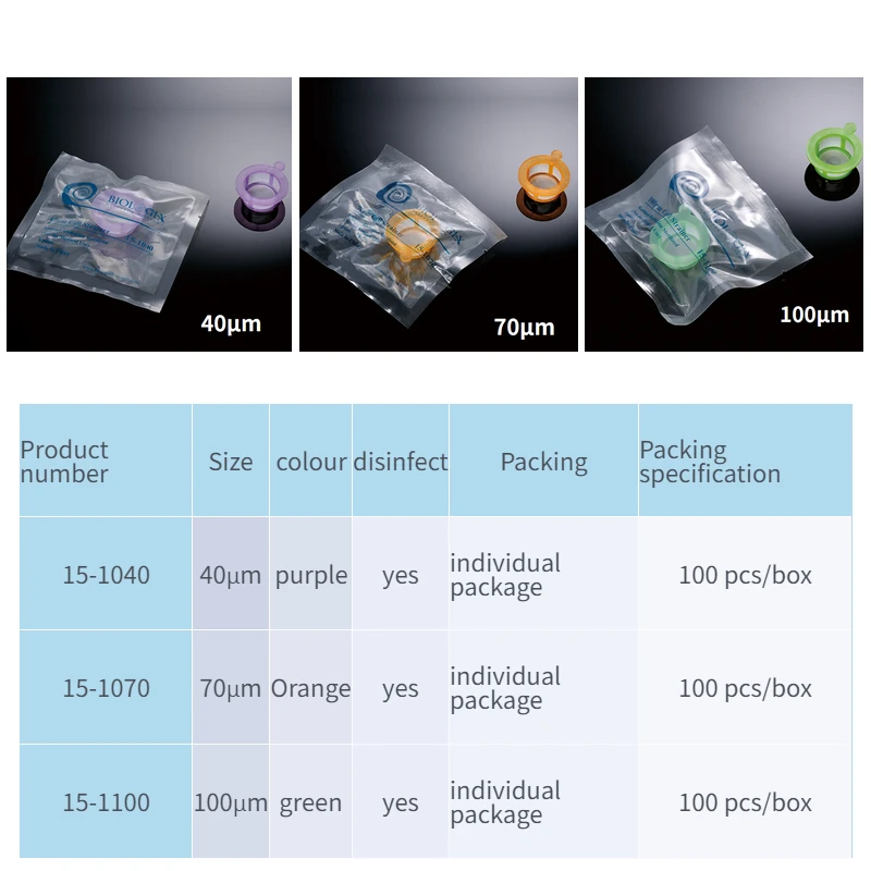 ● Обеспечивает трехэкранные отверстия 40мкм, 70мкм, 100мкм, обеспечивает трехцветный дизайн для удовлетворения различных требований к фильтрации клеток