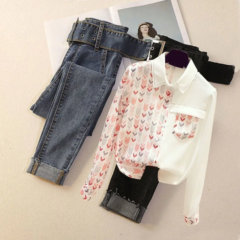Женский костюм из двух предметов, большой размер, женский летний костюм, западный стиль, тонкий ароматный стиль, джинсы, костюм из двух предметов