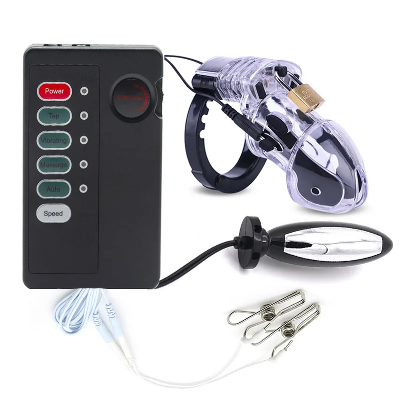 Male Electric Shock CB6000 Chastity Cock Cage Scrotum Lock Ring Penis Sleeve Electro Stimulation Anal Plug Nipple Clamp Sex Toys