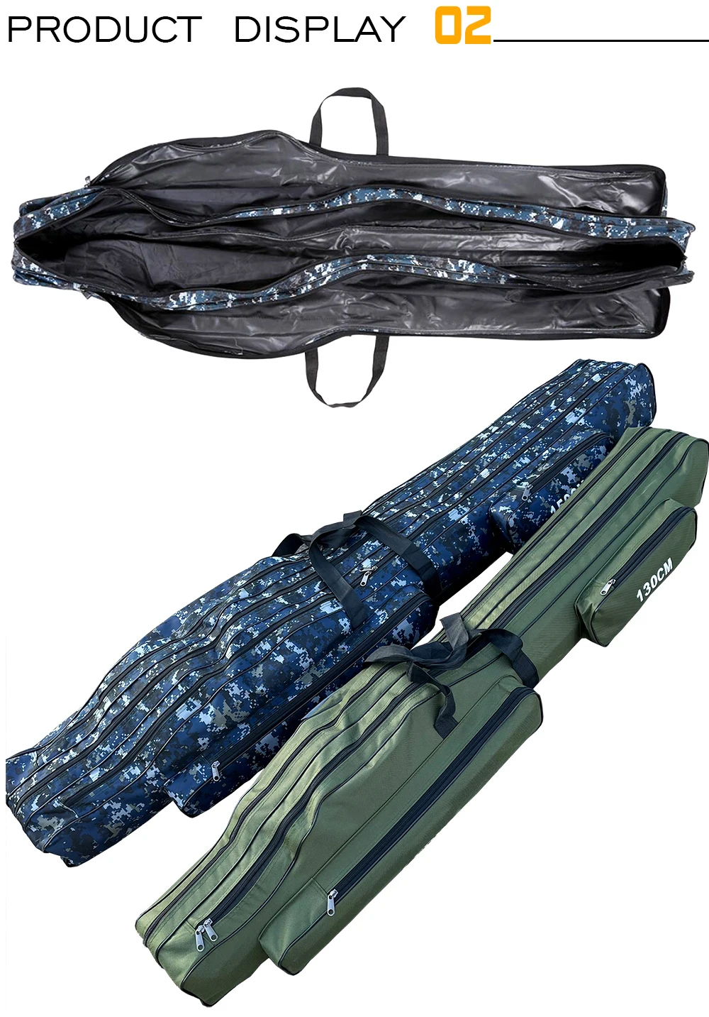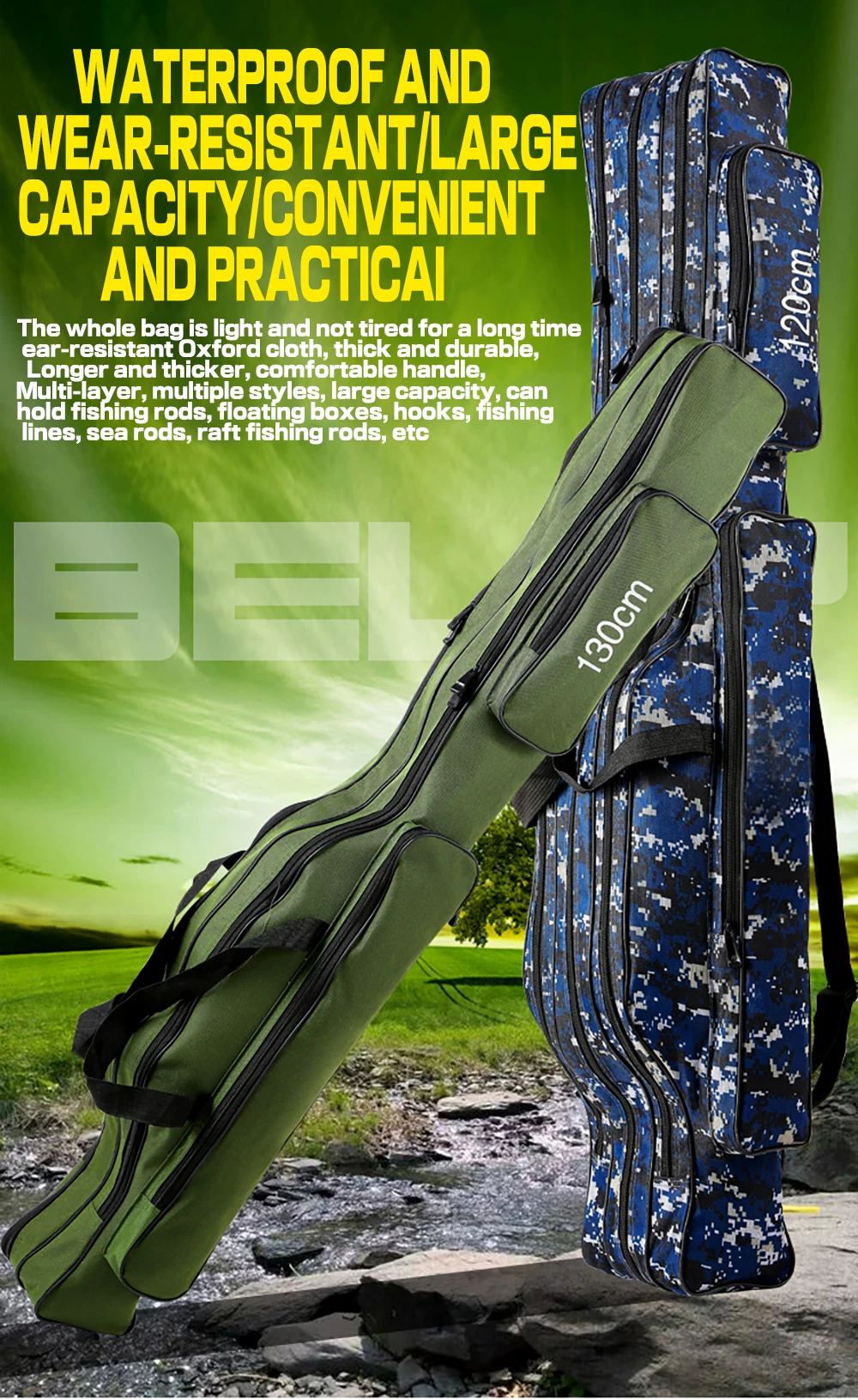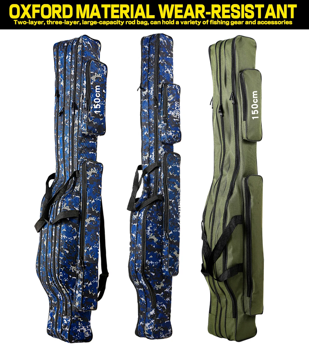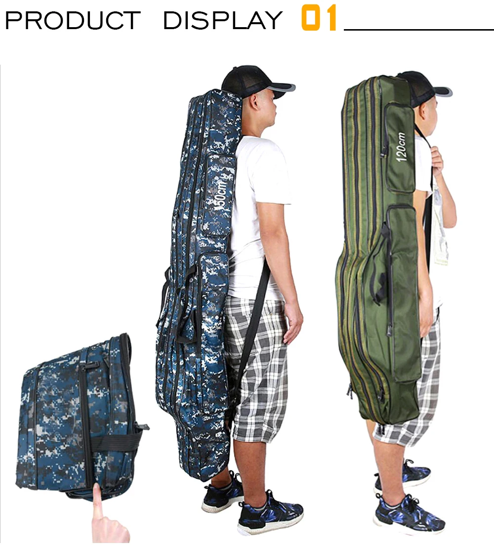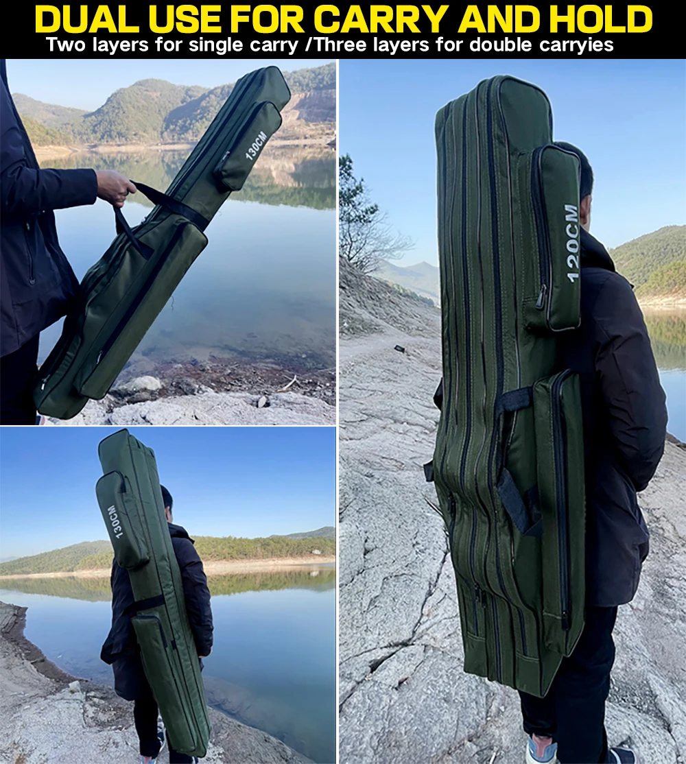 ОсобенностиИзготовлен из холста, водостойкий и износостойкий, очень прочный.Он содержит два или три основных отсека с боковыми мешочками.Большая емкость и регулируемые ремни, удобные и портативные.Замечательный компаньон для рыболовов.Технические характеристикиМатериал: 1280D холстЦвет: зеленый/синий (на выбор)Слой: два/три (по желанию)Длина: 110 см/120 см/130 см/150 см (опционально)Список посылка1 шт. * Рыболовная Сумка