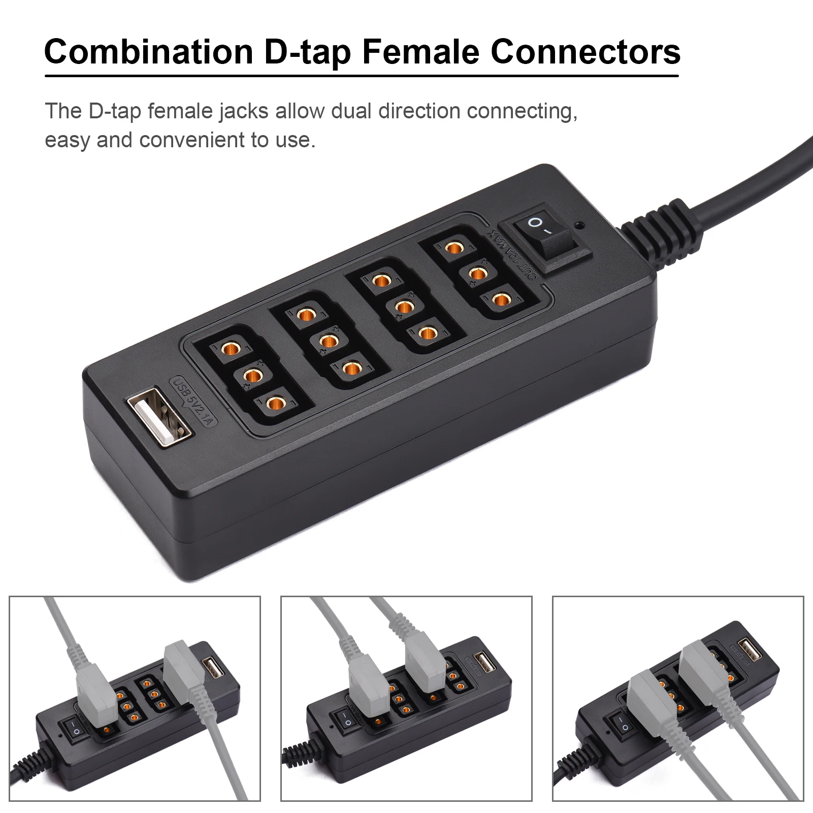 Разъем D-Tap Male & Female:С 1 разъемом D-tap и 4 комбинированными разъемами D-tap female. Женские гнезда D-tap позволяют соединять два направления, поэтому доступны 8 портов.