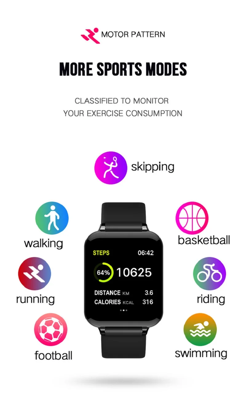 Warm Remind>> 1. APP Support System: Android 4.4 and above, IOS 9.0 and above. 2. Do not use a charger higher than 5V/2A. 3. The data cannot be used as medical reference. Description>> B57 is a Multifunction Sport smart watch, 1.3 inch TFT screen gives you a better using experience and you could adjust the screen brightness in the watch. B57 supports various sport mode monitor, continuous real-time heart rate monitoring and the measurement of blood pressure and blood oxygen, make you better understanding of their own health, more love and care for yourself. The watch not just record your exercise routine data such as distance, steps, calories burned, also automatically monitor your sleep quality during the night, help you develop a good habit. As a fitness helper, calls and message reminder(the message reminder support Multi-language display: Russian, English, Spanish, French, German, Arabisch, Japanese, Korean), you won't miss anything important, no doubt, B57 will be your more intimate sports partner! Features>> 1. Main interface Press the touch area in the main interface, you also could customize the dial with your own photoes. 2. Pedometer step counter Always check the number of steps walking in the day, You can also be synchronized to the APP in time, view and analyze the movement data. 3. Movement distance and calories The device automatically monitors the movement of mileage, calories consumption. 4. Health monitoring Long press to enter the heart rate real-time monitoring, Blood pressure monitoring, blood oxygen monitoring(SPO2). 5. A variety of Sport mode monitoring Press to enter the movement mode monitoring. 8 kinds of Sport Mode available: Walk/Run/Riding/Skipping/Badminton/Basketball/Football/Swimming 6. Sleep quality monitoring Wearing a bracelet to sleep, it can monitor the length of sleep, deep sleep and light sleep state. According to the data, you can adjust the sleep status, improve the health index. 7. Messages reminder/Message push When there is new message, the device will vibrate to remind you and display the message on screen. The corresponding message displays the corresponding icon, the AW4 will retain the current 3 messages. And the messages support Multi-language display: Russian, English, Spanish, French, German, Arabisch, Japanese, Korean and etc. 8. Music Remote Control You could remote your mobile phone music when the watch connect with app, convenient for your running with music, not need to take out your mobile phone from your pocket to change music any more. 9. Multi-language Support The watch support Russian, Ukrainian, English, Spanish, French, German, Arabisch, Japanese, Korean. And the application support Russian, Ukrainian, English, Spanish, French, German, Arabisch, Japanese, Korean, Italian, Portuguese 10. Creative Watch Dial You could use your own photoes to customize the watch background, make your own style watch. 11. More Functions Screen brightness adjustment, Weather forecast, Incoming call remind, Stopwatch, Alarm clock, Sedentary reminder, Find bracelet, Remote control camera. Specification>> Brand: OLOPKY Model: B57 Chip: nRF52832 Screen: 1.3inch TFT 240x240 Pixel Screen Material: Color IPS Operation: Touch button Time format: 12/24 Hours Connection: Bluetooth 4.0 Water resistant: IP67 Battery type: Polymer lithium battery Battery Capacity: 180mah Charge: USB cable charger Watch Language: Russian, Ukrainian, English, Spanish, French, German, Italian, Portuguese, Arabisch, Japanese, Korean About Size>> Watch Weight: 25.7g Case Size: 40mm Band fits 125-185mm wrists What is in the box>> 1 x B57 Fitness Bracelet Watch 1 x English User Manual 1 x Charging Cable